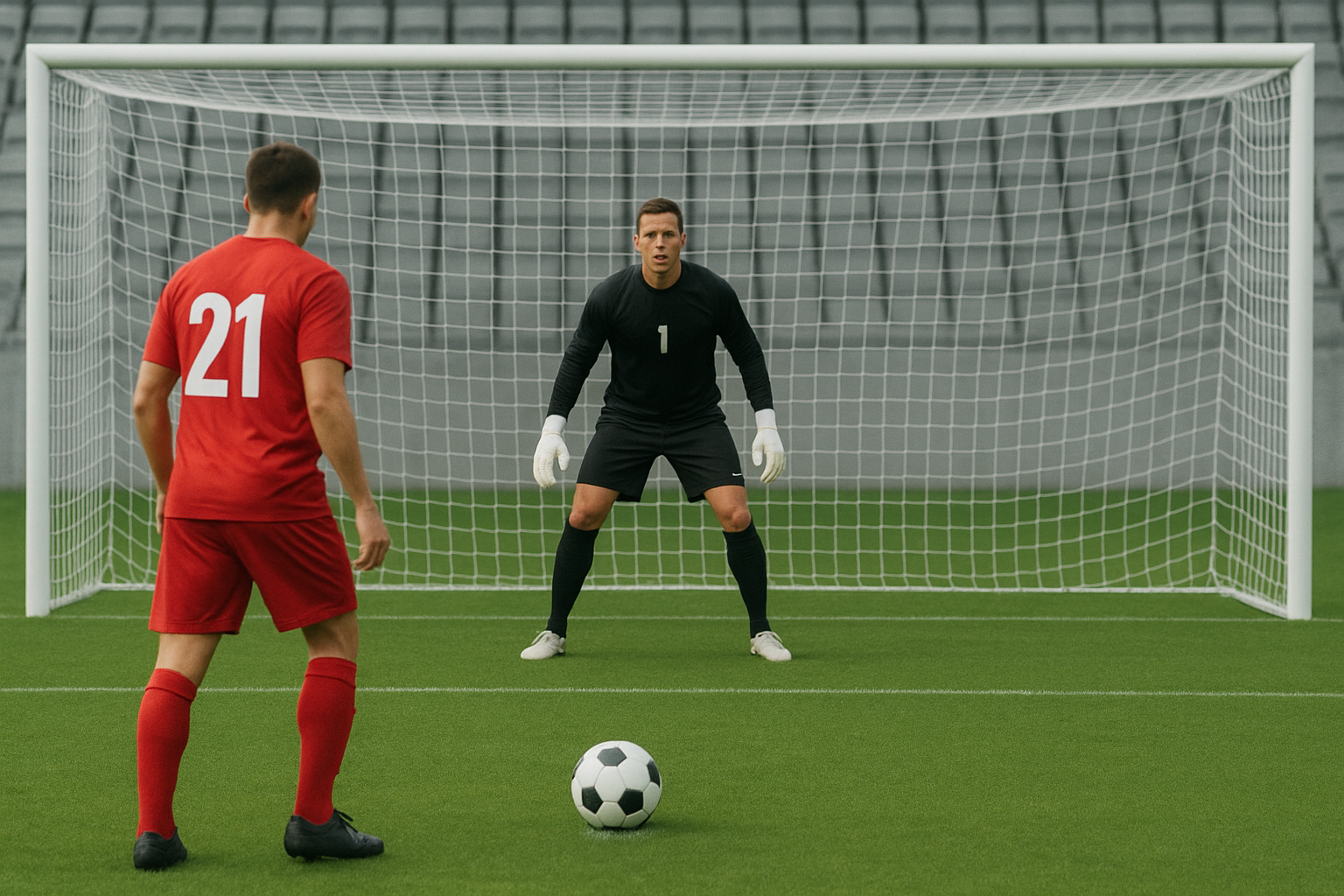 Fotoğraf: ChatGPT (“Futbol sahasından bir görüntü istiyorum, bir kaleci penaltı sırasında kalesinde ve penaltıyı kullanacak olan oyuncu da tam topununa vuracak şekilde penaltı noktasında, kale tümüyle görünüyor, iki futbolcu da tam olarak görünüyor, kalecinin forma numarası 1, futbolcunun forma numarası 21” prompt’uyla yaratıldı.)