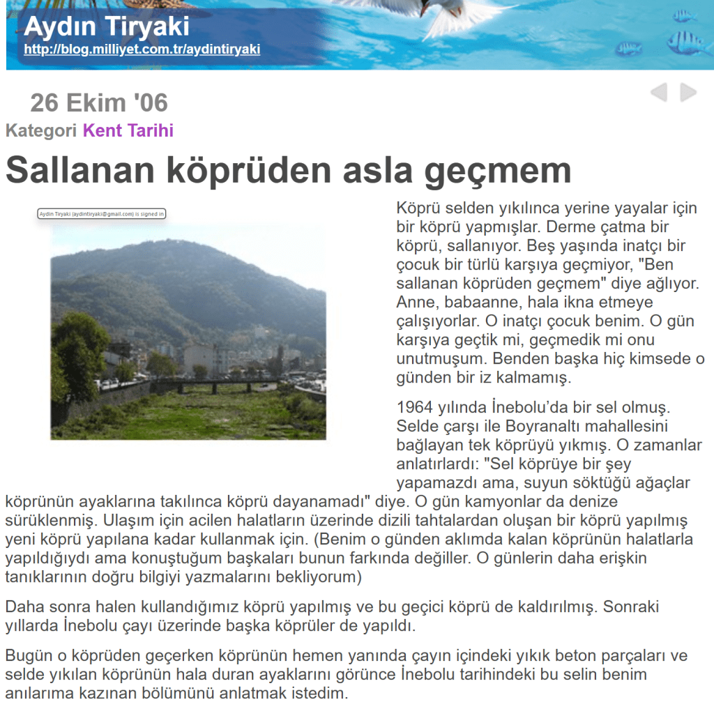 2006 yılından 2009 yılına kadar Milliyet Blog’da yazdığım yazılarda zaman zaman İnebolu Çayı’na değinmiştim. 2006’da “Sallanan Köprüden Asla Geçmem” başlıklı yazıda beş yaşlarındayken İnebolu Çayı üzerinde geçici yapılan ve sallanan köprüden geçmemek için nasıl direndiğimi anlatırken 1963 yılındaki İnebolu Çayı’ndaki köprüyü alıp giden büyük seli duyduklarımla anlatmıştım (1) . Hatta o yıllarda yazdığım tüm yazılarda selin olduğu yılı 1964 diye belirtmiştim. Her ne kadar İnternet’i etkin kullandığım yıllar olsa da olanaklar daha kısıtlıydı. Oysa yakın yıllarda bu araştırmayı yaptığımda 2021 yılında Mustafa Fakazlı’nın yazdığı yazıda sadece yıl değil, gününe kadar verilmişti (2). Arık 22 Temmuz 1963 tarihinin İnebolu’daki büyük selin tarihi olduğunu biliyordum. İnebolu’nun tarihi konusunda en bilgili isim olan Mustafa Fakazlı bu yazısıyla yine yardıma koşmuştu.