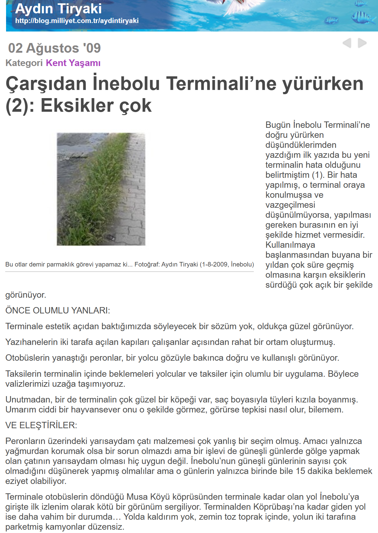 (5) Aydın Tiryaki “Çarşıdan İnebolu Terminali’ne yürürken (2): Eksikler çok”, 2 Ağustos 2009 – Milliyet Blog