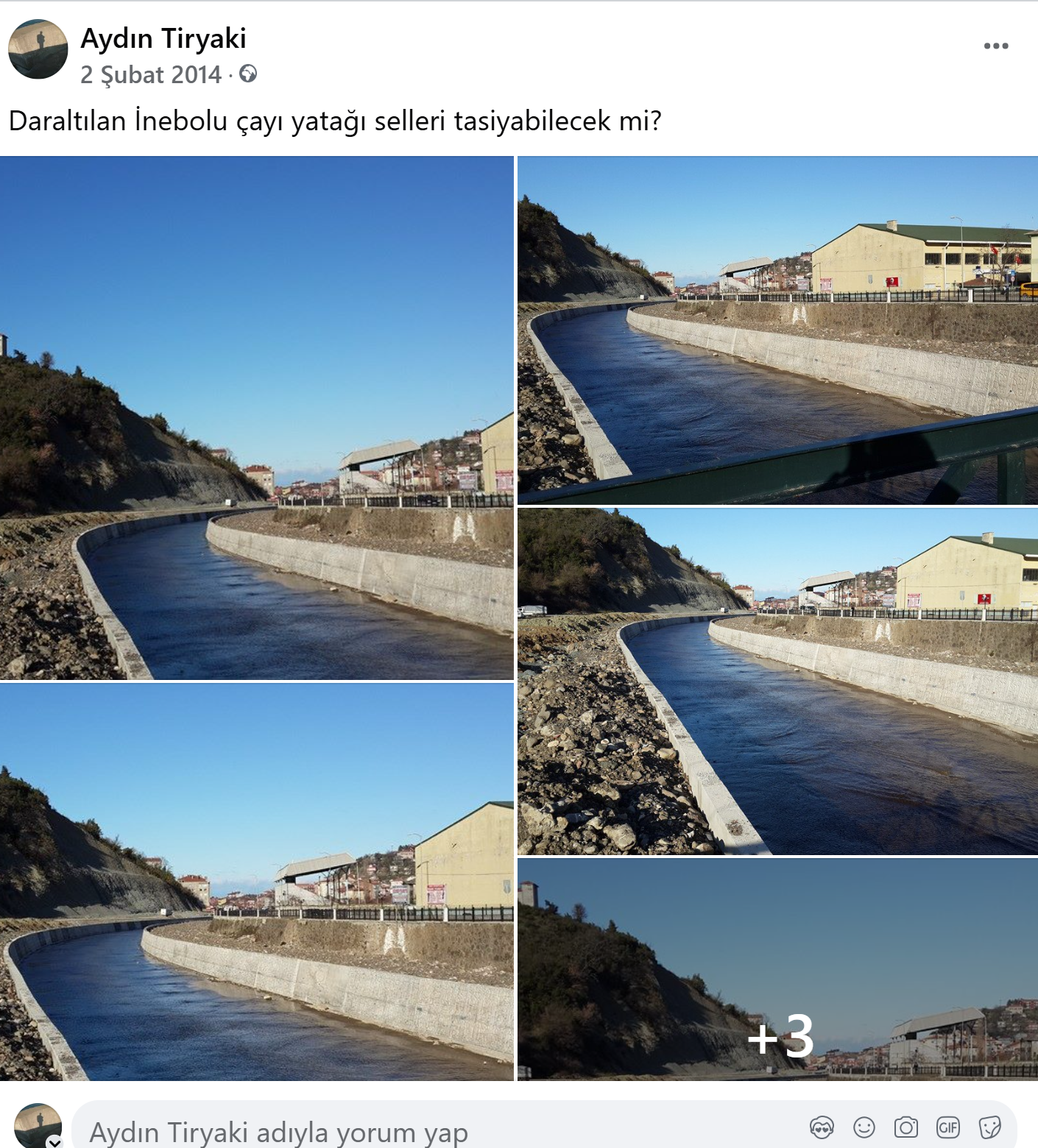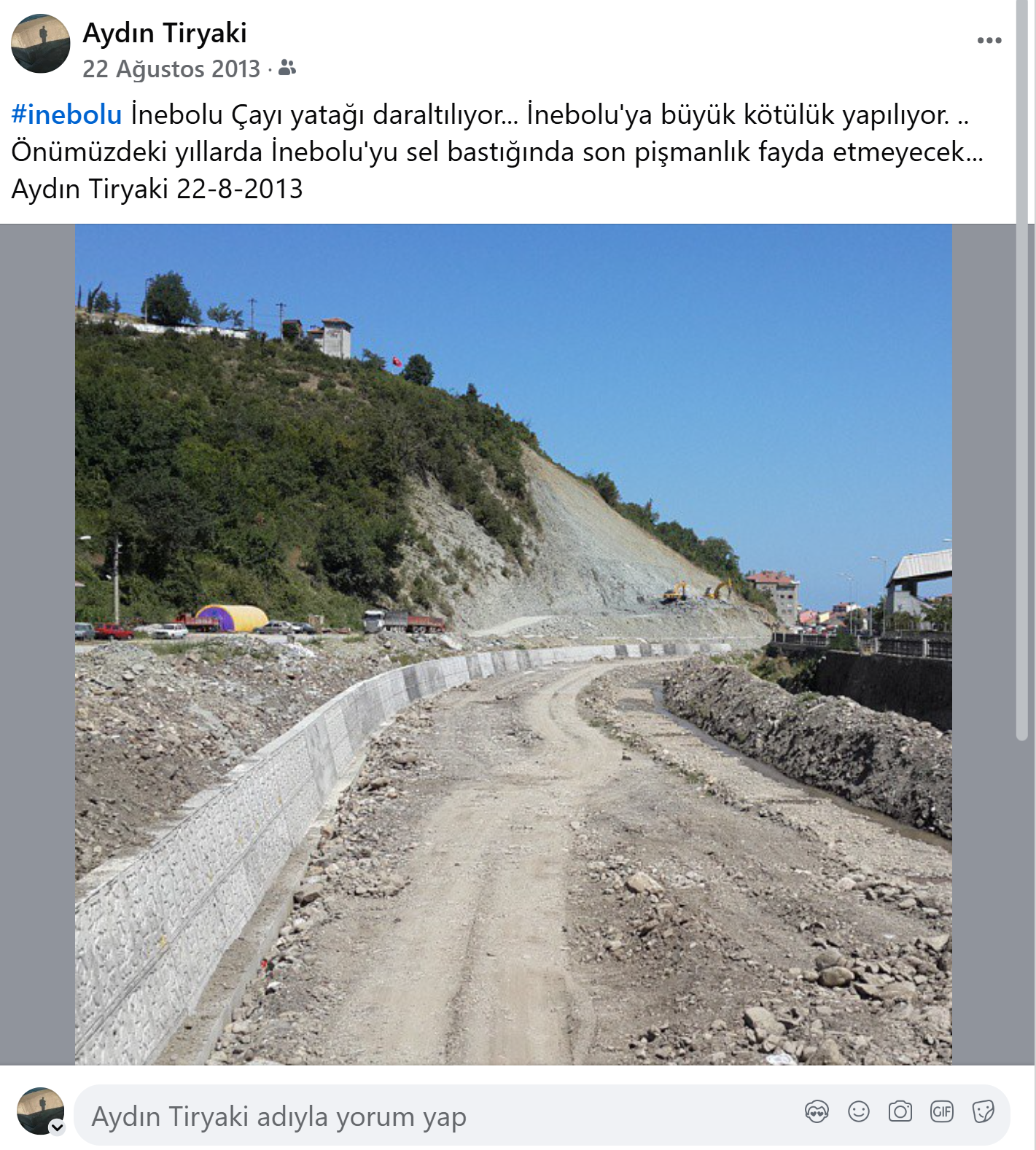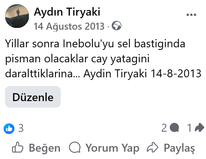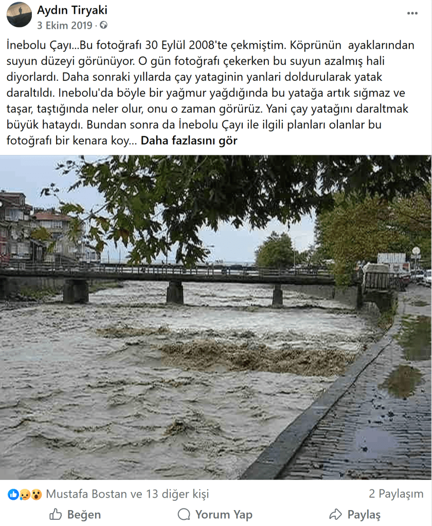 2013 yılında İnebolu’da çayın içinde çalışmalar başlayıp, yatağını daralttıklarını görünce çayın içindeki çalışmalardan çektiğim bir fotoğrafın altına kısa ve net yazmıştım (1) : “Yıllar sonra İnebolu’yu sel bastığında pişman olacaklar çay yatağını daralttıklarına…” Bir başka Facebook paylaşımında fotoğrafın altına (2) “… İnebolu’ya büyük kötülük yapılıyor.” diye yazmıştım. Bu iki paylaşımdan daha net ne yazılabilirdi.