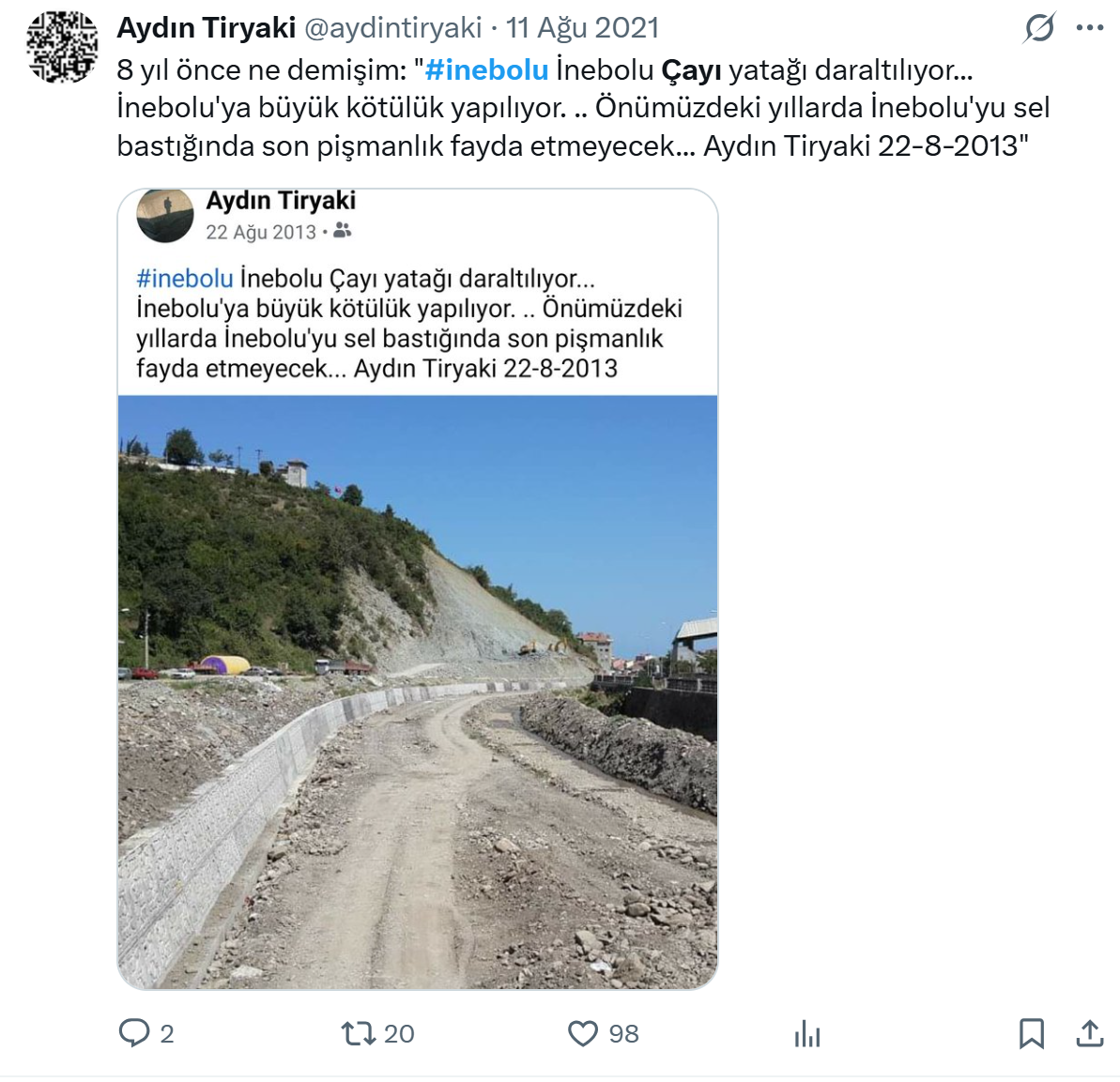 8 yıl önce ne demişim: “#inebolu İnebolu Çayı yatağı daraltılıyor… İnebolu’ya büyük kötülük yapılıyor… Önümüzdeki yıllarda İnebolu’yu sel bastığında son pişmanlık fayda etmeyecek… Aydın Tiryaki 22-8-2013″