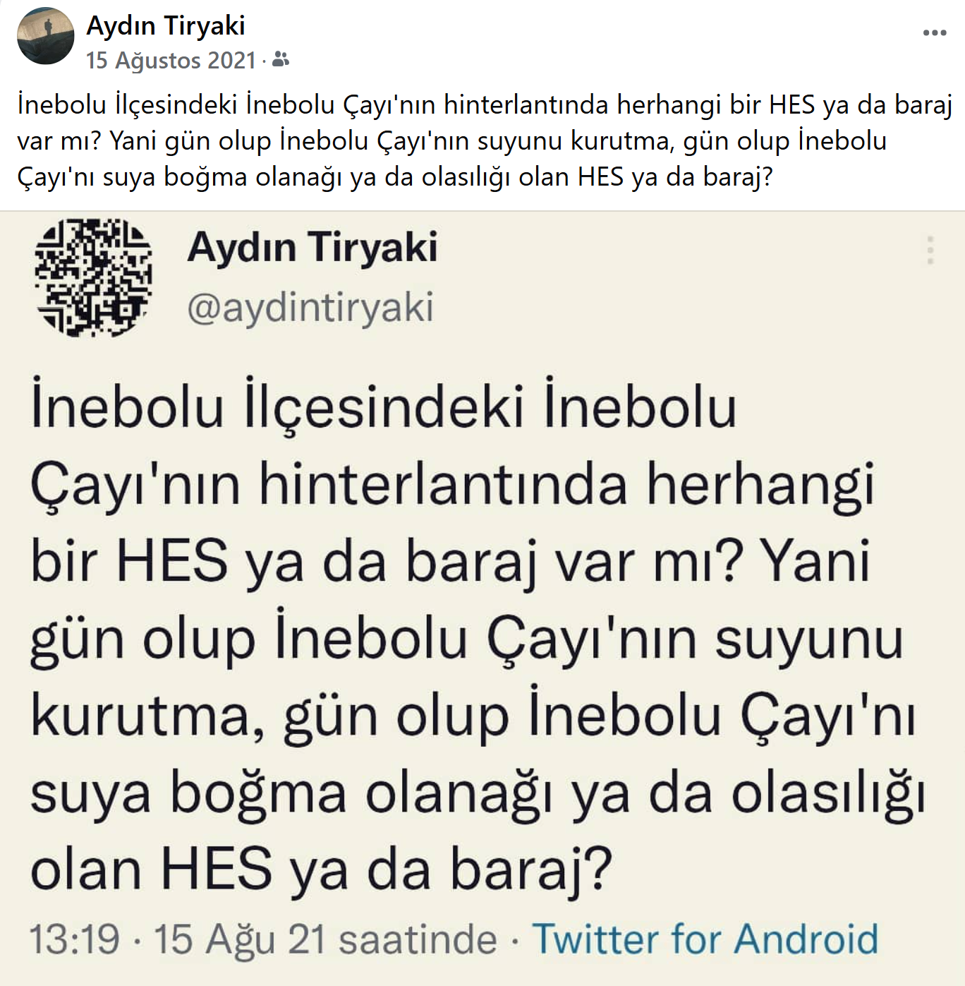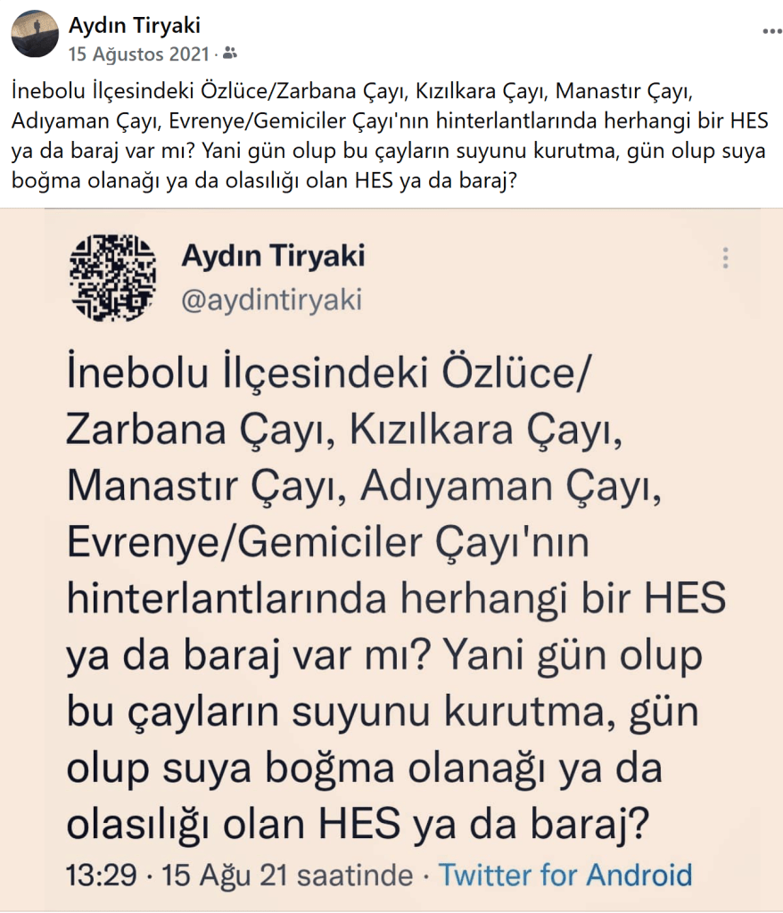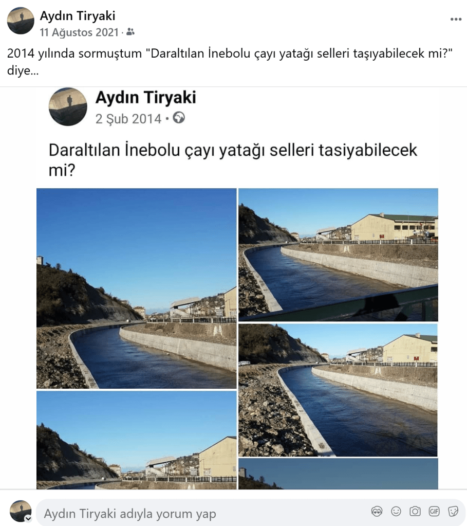 11 Ağustos 2021 günü Ankara’da haberleri izlerken hem Bozkurt için üzülüp hem de İnebolu için endişeleniyordum. Kızkardeşim ve eşi İnebolu’dalardı. Onlardan bilgi alıyordum. İnebolu Çayı’nın coşkun akışının sesinin evden duyulduğunu söylüyorlardı. Hemen aklıma 7 yıl önce paylaştığım soru geldi ve” 2014 yılında sormuştum “Daraltılan İnebolu çayı yatağı selleri taşıyabilecek mi?” diye…” Facebook paylaşımını yaptım (1) ve Twitter’da da 8 yıl önce yazdığım ilettim (3): “İnebolu Çayı yatağı daraltılıyor… İnebolu’ya büyük kötülük yapılıyor“.