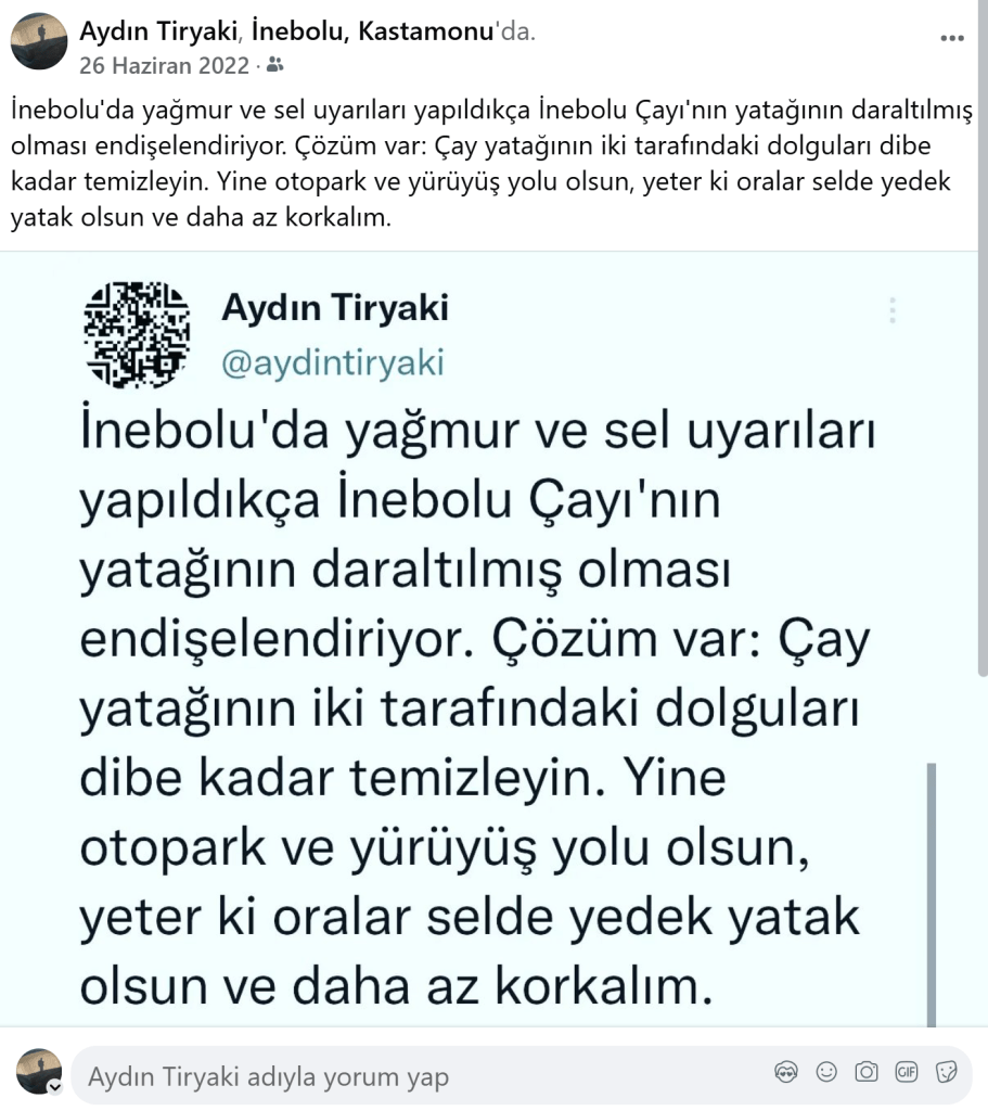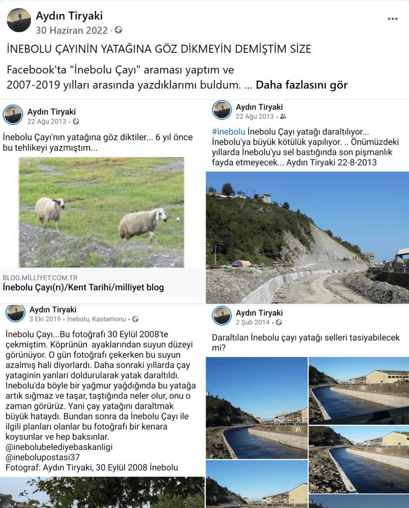 “İnebolu Çayı yatağı daraltılıyor. İnebolu’ya büyük kötülük yapılıyor. Önümüzdeki yıllarda İnebolu’yu sel bastığında son pişmanlık fayda etmeyecek… Aydın Tiryaki 22-8-2013” yazmışım. İste o seller 8 ve 9 yıl sonra oldu.