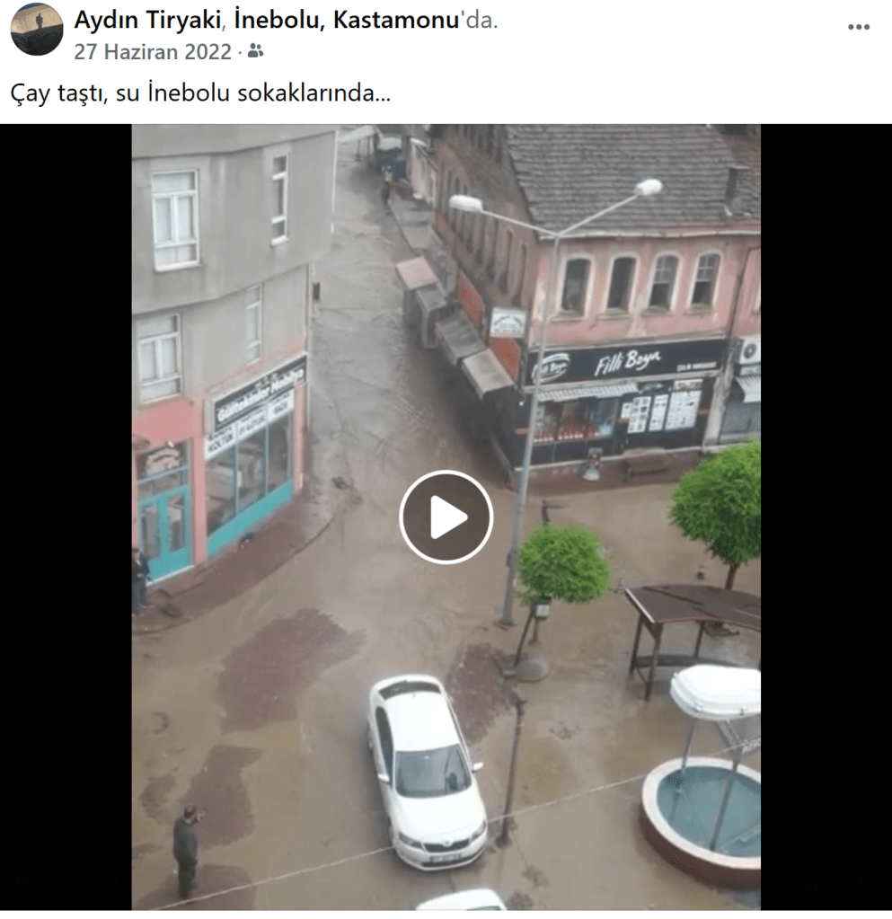 27 Haziran 2022’de yani sel günü, meydana bakan ve bir sokaktan doğru çayın dar bir bölümünü gören evimizden aşağıda olanları izledik. “Çay taştı, su İnebolu sokaklarında…” bilgisini sosyal medyadan ilettim. O sırada birçok hesaptan canlı yayınlar yapılıyordu. Bir süre sonra çayın seviyesinin yükseldiğini farkettik (3). Oluşan selde çayın yükselen seviyesi taşmalara neden olunca çayın çarşı tarafındaki kaldırımlarına kamyonlarla malzeme dökülerek akış engellendi. Terminal tarafına yapılan tartışmalı köprü üzerinde iş makinalarıyla bir tıkanmanın önüne geçmeye çalıştıklarını canlı yayınlarda görüyorduk.