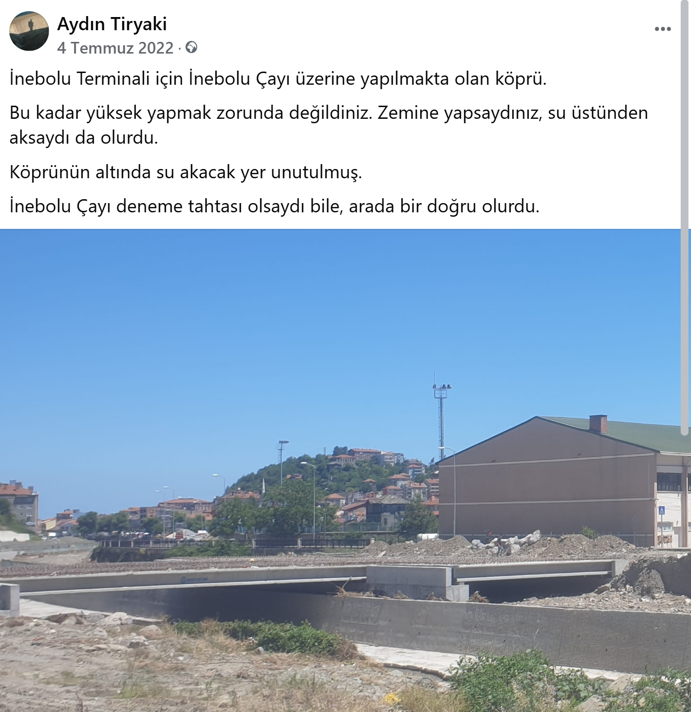 Birkaç gün sonra, sel günü ilgi odağı olan Terminal Köprüsünü gördüm ve dedim ki (5) “İnebolu Terminali için İnebolu Çayı üzerine yapılmakta olan köprü. Bu kadar yüksek yapmak zorunda değildiniz. Zemine yapsaydınız, su üstünden aksaydı da olurdu. Köprünün altında su akacak yer unutulmuş. İnebolu Çayı deneme tahtası olsaydı bile, arada bir doğru olurdu. Aydın Tiryaki – 4 Temmuz 2022”