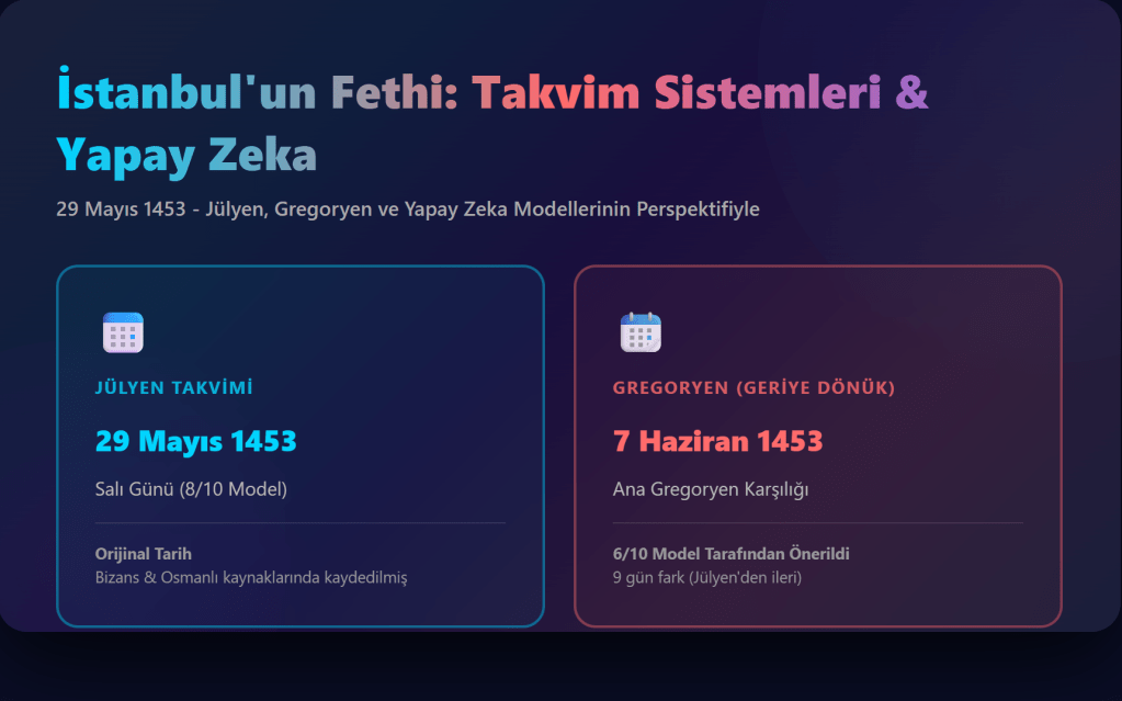 Yanıt: Tüm modeller 29 Mayıs 1453 tarihini Jülyen takvimine göre olduğu bilgisini verdi.