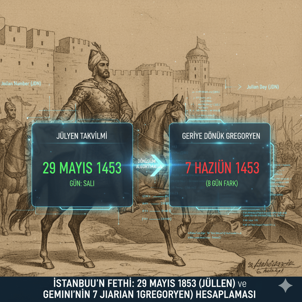 İstanbul’un fethi olan 29 Mayıs 1453 tarihi, o dönemde hem Hristiyan Bizans İmparatorluğu’nun hem de Müslüman Osmanlı İmparatorluğu’nun resmi olarak kullandığı Jülyen Takvimi’ne göredir. Gregoryen takvim, bu tarihten çok sonra, 1582’de kabul edilmiştir. Dolayısıyla, fetih günü Jülyen takvimine göre 29 Mayıs 1453’tür.