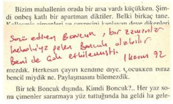 1992 yılında bir kitapta okuduğum yazı Boncuk’u anımsattı. “Cam üzerinde cambazlar” başlıklı yazının olduğu sayfaya kırmızı kalemle bir not düşmüşüm: “Sözü edilen Boncuk, bir zamanlar İnebolu’ya gelen Boncuk olabilir. Beni çok etkilemişti.. 1 Kasım 92”