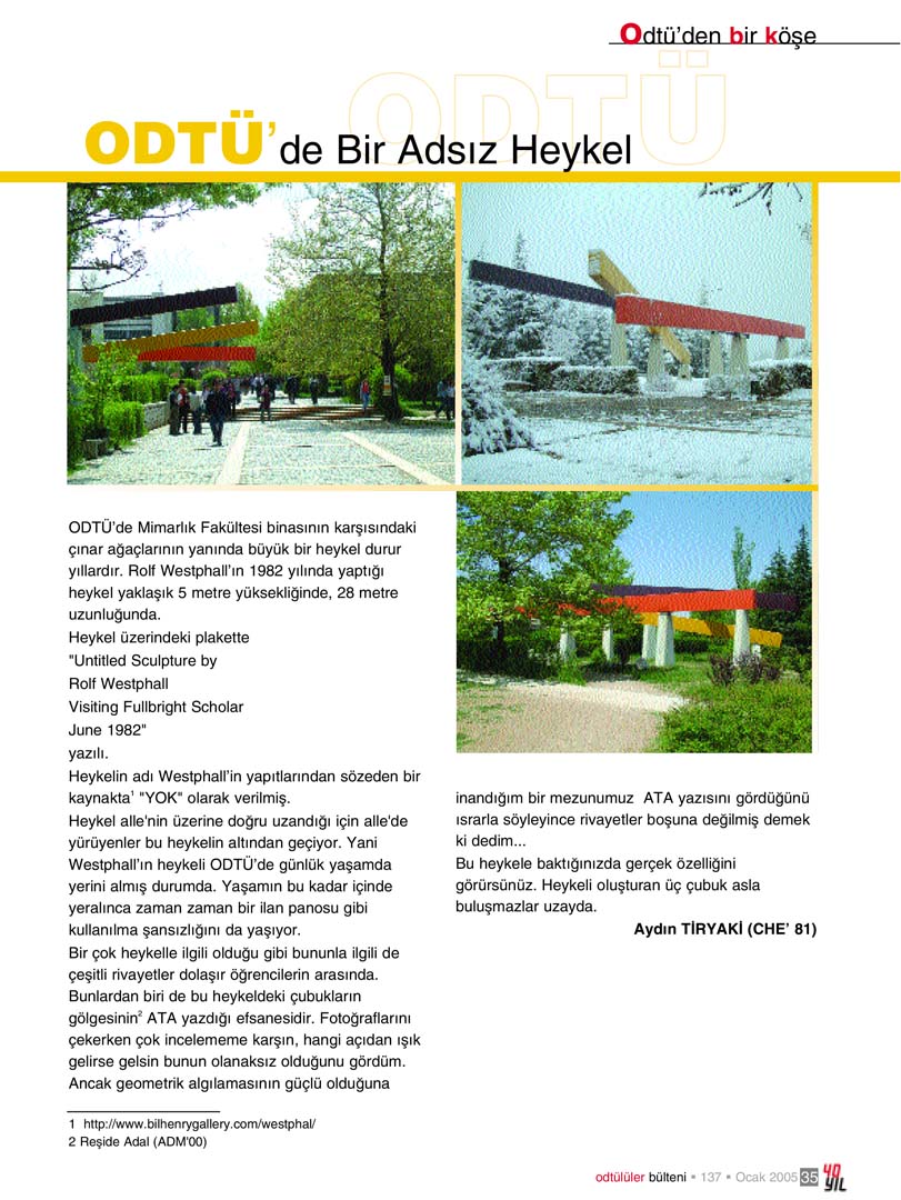 ODTÜ’de Mimarlık Fakültesi binasının karşısındaki çınar ağaçlarının yanında büyük bir heykel durur yıllardır. Rolf Westphall’ın 1982 yılında yaptığı heykel yaklaşık 5 metre yüksekliğinde, 28 metre uzunluğunda.