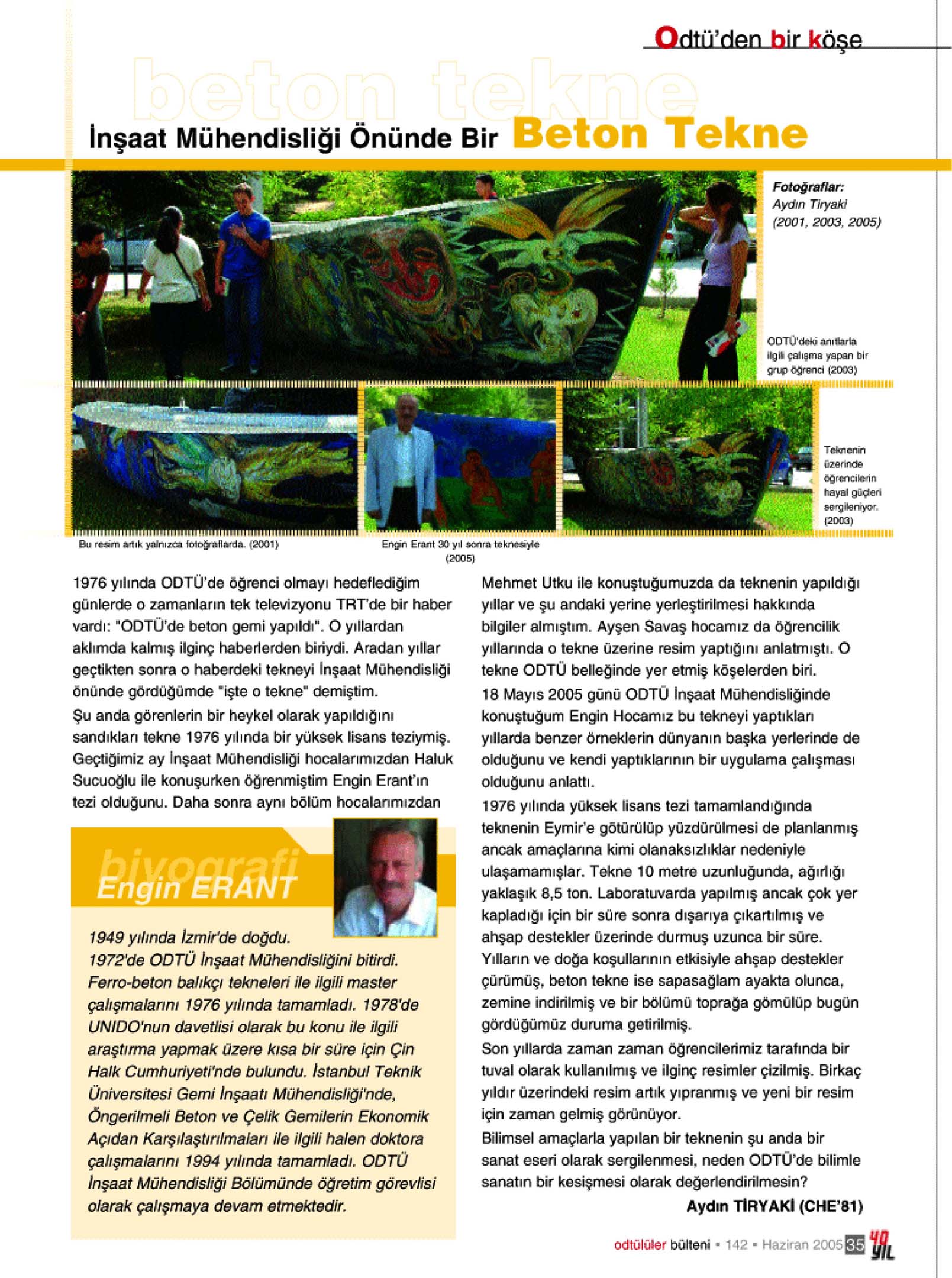 1976 yılında ODTÜ’de öğrenci olmayı hedeflediğim günlerde o zamanların tek televizyonu TRT’de bir haber vardı: “ODTÜ’de beton gemi yapıldı”. O yıllardan aklımda kalmış ilginç haberlerden biriydi. Aradan yıllar geçtikten sonra o haberdeki tekneyi İnşaat Mühendisliği önünde gördüğümde “işte o tekne” demiştim.
