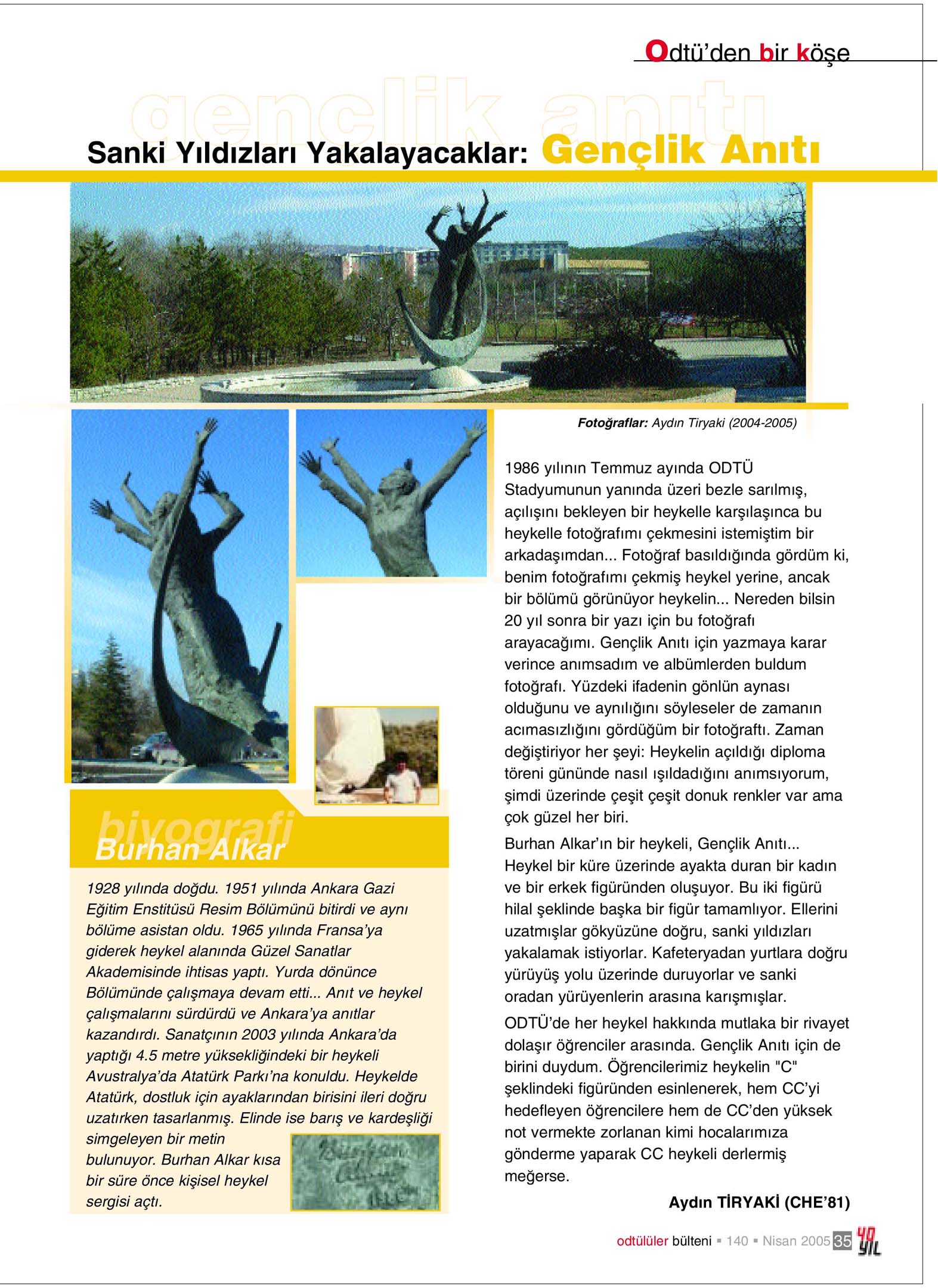 1986 yılının Temmuz ayında ODTÜ stadyumunun yanında üzeri bezle sarılmış açılışını bekleyen bir heykelle karşılaşınca bu heykelle fotoğrafımı çekmesi istemiştim bir arkadaşımdan… Fotoğraf basıldığında gördüm ki, benim fotoğrafımı çekmiş heykel yerine, ancak bir bölümü görünüyor heykelin… Nereden bilsin 20 yıl sonra bir yazı için bu fotoğrafı arayacağımı. Gençlik Anıtı için yazmaya karar verince anımsadım ve albümlerden buldum fotoğrafı. Yüzdeki ifadenin gönlün aynası olduğunu ve aynılığını söyleseler de zamanın acımasızlığını gördüğüm bir fotoğraftı Zaman değiştiriyor herşeyi: Heykelin açıldığı diploma töreni gününde nasıl ışıldadığını anımsıyorum, şimdi üzerinde çeşit çeşit donuk renkler var ama çok güzel her biri.