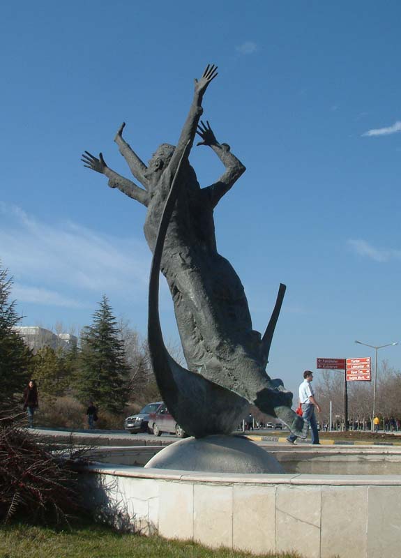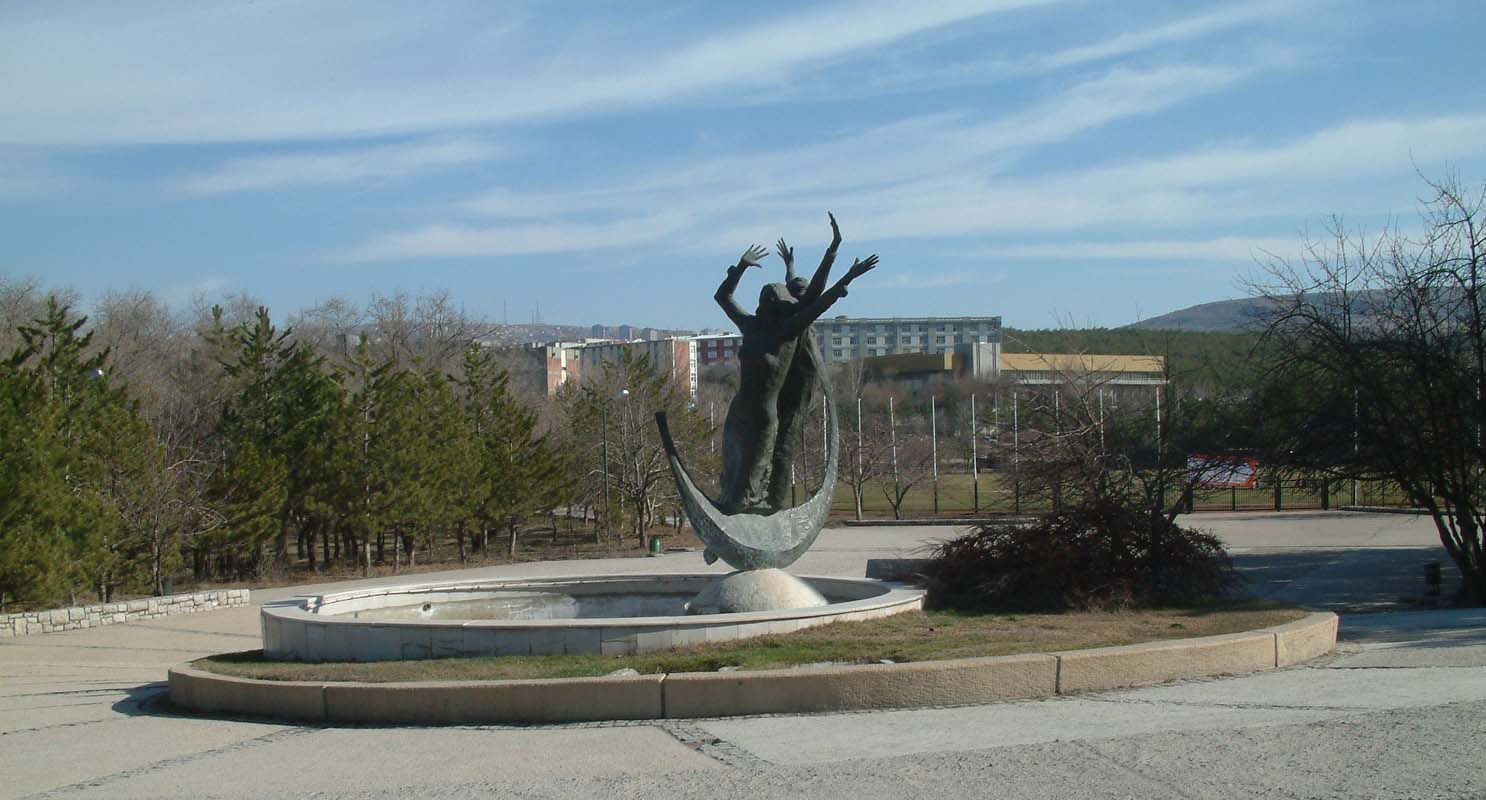 Burhan Alkar’ın bir heykeli, Gençlik Anıtı… Heykel bir küre üzerinde ayakta duran bir kadın ve bir erkek figüründen oluşuyor. Bu iki figürü hilal şeklinde başka bir figür tamamlıyor. Ellerini uzatmışlar gökyüzüne doğru, sanki yıldızları yakalamak istiyorlar. Kafeteryadan yurtlara doğru yürüyüş yolu üzerinde duruyorlar ve sanki oradan yürüyenlerin arasına karışmışlar.