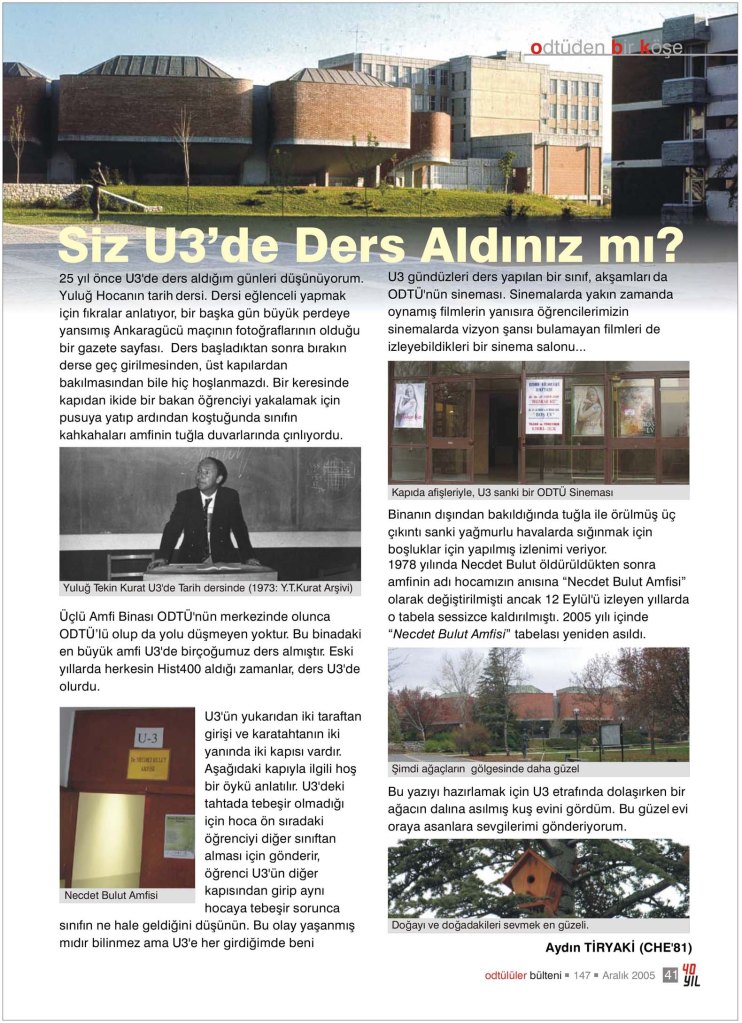 25 yıl önce U3’te ders aldığım günleri düşünüyorum. Yuluğ Hocanın tarih dersi. Dersi eğlenceli yapmak için fıkralar anlatıyor, bir başka gün büyük perdeye yansımış Ankaragücü maçının fotoğraflarını olduğu bir gazete sayfası. Ders başladıktan sonra bırakın derse geç girilmesinden, üst kapılardan bakılmasından bile hiç hoşlanmazdı. Bir keresinde kapıdan ikide bir bakan öğrenciyi yakalamak için pusuya yatıp ardından koştuğunda sınıfın kahkahaları amfinin tuğla duvarlarında çınlıyordu.