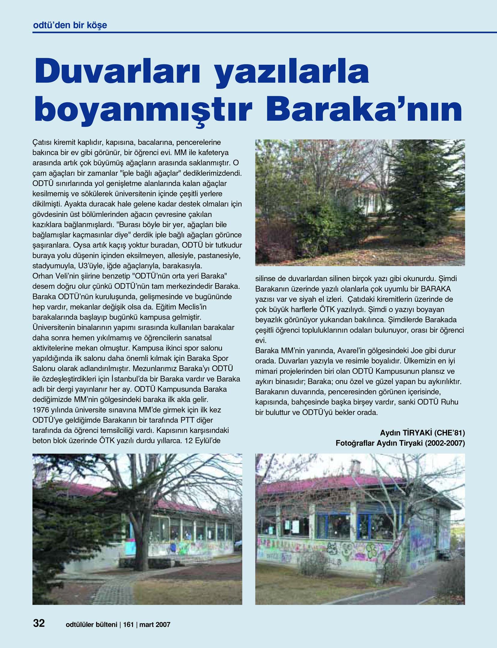 1976 yılında üniversite sınavına MM’de girmek için ilk kez ODTÜ’ye geldiğimde Barakanın bir tarafında PTT diğer tarafında da öğrenci temsilciliği vardı. Kapısının karşısındaki beton blok üzerinde ÖTK yazılı durdu yıllarca. 12 Eylül’de silinse de duvarlardan silinen birçok yazı gibi okunurdu. Şimdi Barakanın üzerinde yazılı olanlarla çok uyumlu bir BARAKA yazısı var ve siyah el izleri. Çatıdaki kiremitlerin üzerinde de çok büyük harflerle ÖTK yazılıydı. Şimdi o yazıyı boyayan beyazlık görünüyor yukarıdan bakılınca. Şimdilerde Barakada çeşitli öğrenci topluluklarının odaları bulunuyor, orası bir öğrenci evi.