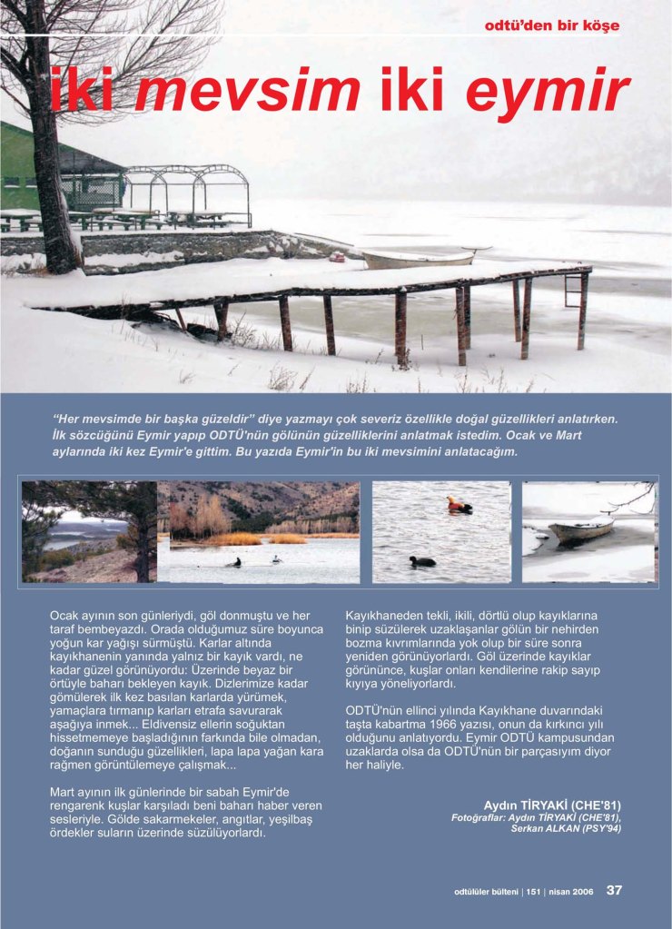 ODTÜ’nün ellinci yılında Kayıkhane duvarındaki taşta kabartma 1966 yazısı orada da kırkıncı yıl olduğunu anlatıyordu. Eymir ODTÜ kampusundan uzaklarda olsa da ODTÜ’nün bir parçasıyım diyor her haliyle.