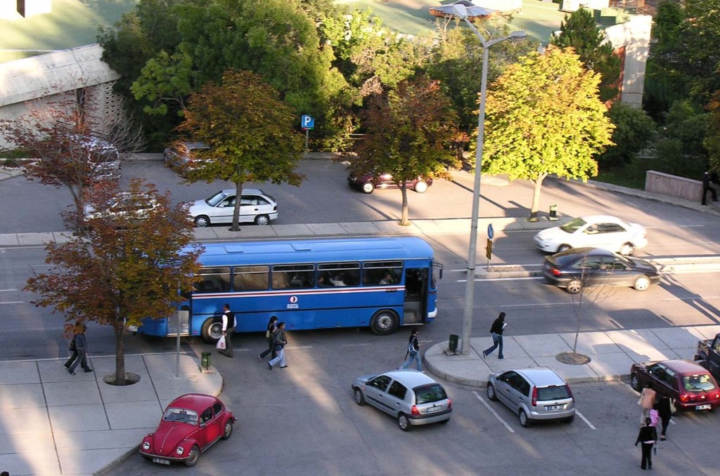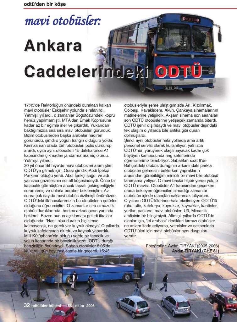 17:45’de Rektörlüğün önündeki duraktan kalkan mavi otobüsler Eskişehir yolunda sıralanırdı. Yetmişli yıllardı, o zamanlar Söğütözü’ndeki köprü henüz yapılmamıştı. MTA’dan Emek Köprüsüne kadar az bir eğimle iner ve çıkardık. Yukarıdan baktığımızda sıra sıra mavi otobüsleri görürdük. Bizim otobüslerden başka arabalar nadiren görünürdü, şimdi o yoğun trafiğin olduğu o yolda. Kimi zaman orada tüm otobüsleri polis durdurup arardı, oysa aynı otobüsleri 15 dakika önce A1 kapısından çıkmadan jandarma aramış olurdu. Yetmişli yıllardı.