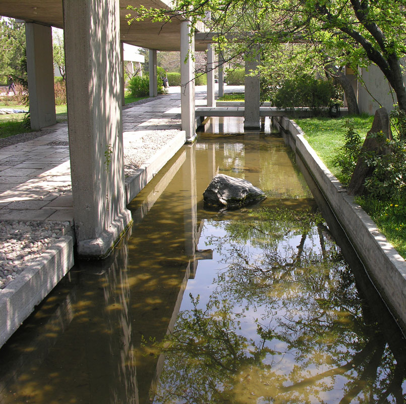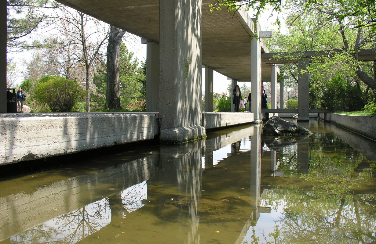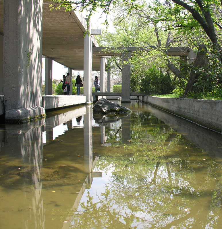 Mimarlık binasına üstü betonla kapatılmış Arkad’dan doğru yürürken solda suda yansıyan güzellikler görürüz, orası Mimarlık havuzudur.