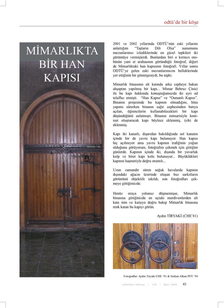 Mimarlık binasının alt katında arka cepheye bakan ahşaptan yapılmış bir kapı… Mimar Behruz Çinici ile bu kapı hakkında konuştuğumuzda iki ayrı ad telaffuz etmişti. “Han Kapısı” ve “Osmanlı Kapısı”. Binanın projesinde bu kapının olmadığını, bina yapımı sürerken binanın sağır cephesinden batıya açılan, öğrencilerin kullanabilecekleri bir kapı düşündüğünü anlatmıştı. Binanın mimarisiyle kontrast oluşturacak kapı böylece eklenmiş, iyiki de eklenmiş.