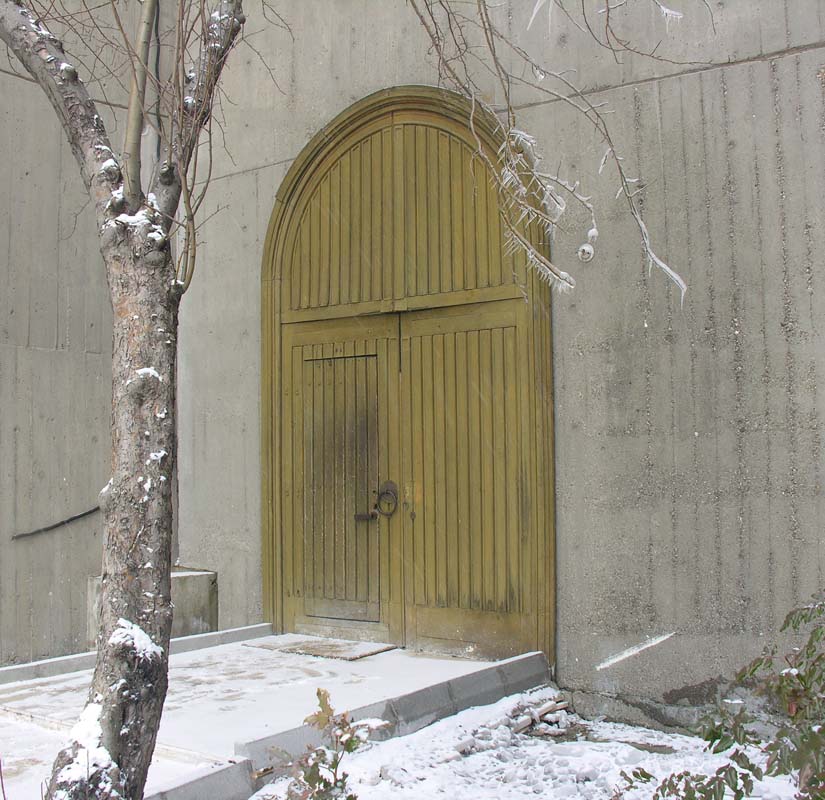 Mimarlık binasının alt katında arka cepheye bakan ahşaptan yapılmış bir kapı…