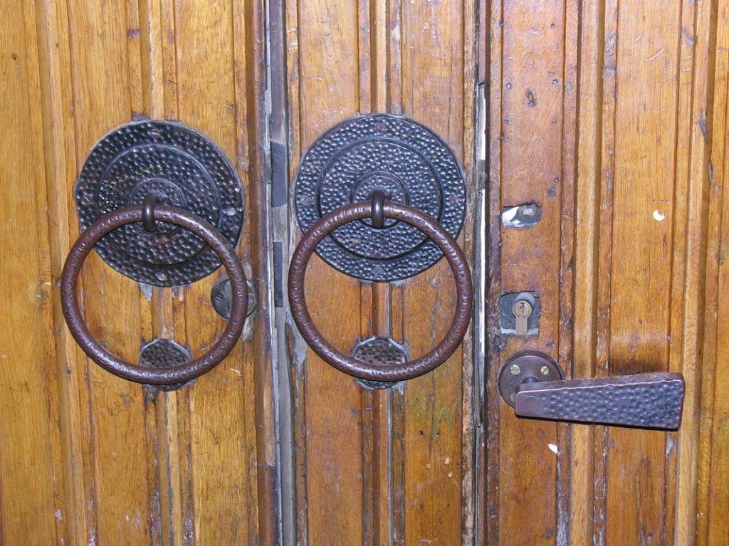 Kapı iki kanatlı, dışarıdan bakıldığında sol kanatın içinde bir de yavru kapı bulunuyor. Han kapısı hiç açılmıyor ama yavru kapının trafiğinin yoğun olduğunu görüyorum, fotoğrafını çekmek için gittiğim günlerde. Kapının içinde iki, dışında bir yuvarlak kulp ve birer kapı kolu bulunuyor… Büyüklükleri kapının haşmetiyle doğru orantılı…