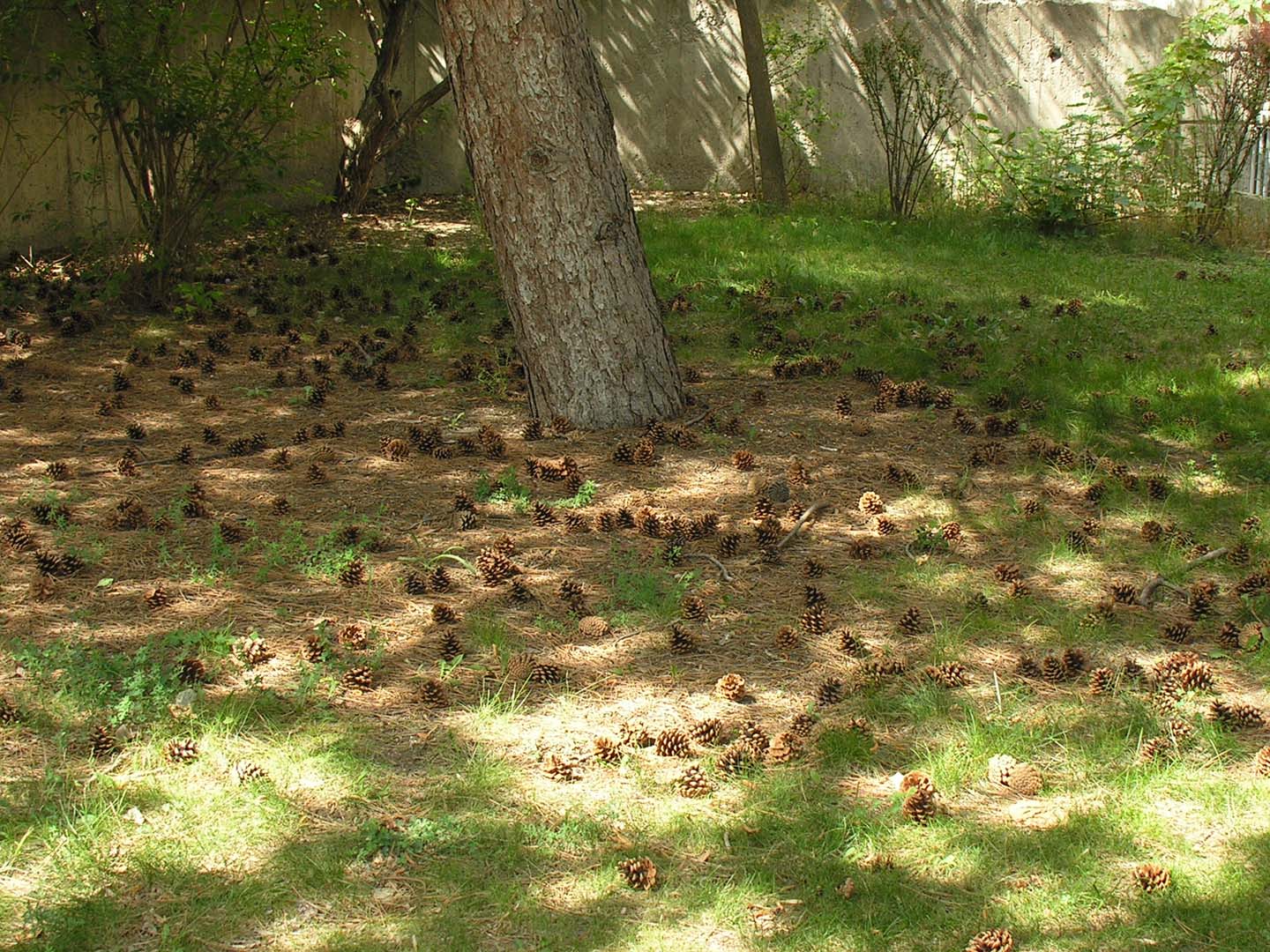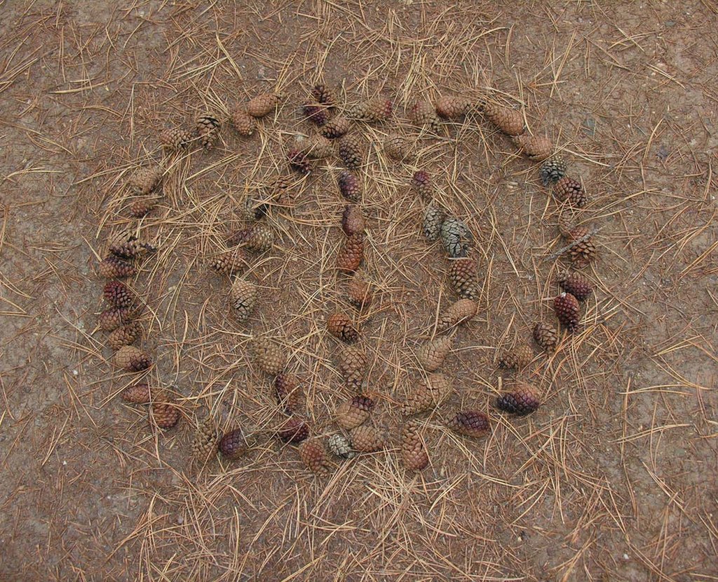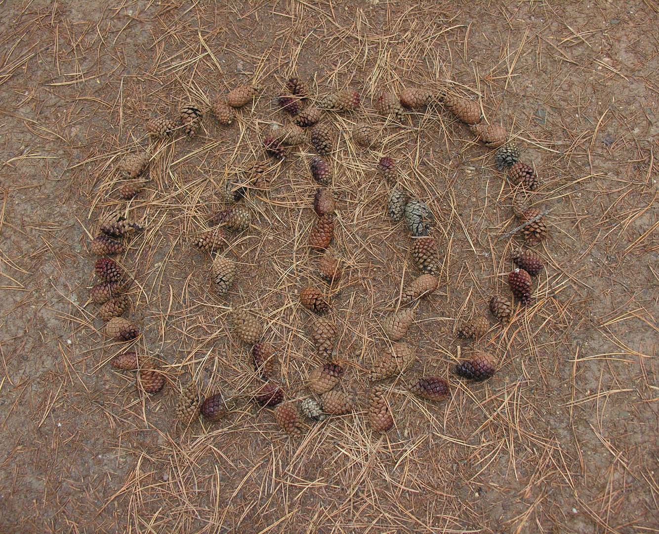 2005 yılının Kasım ayıydı, bir Pazar günü Gıda Mühendisliğine giden ağaçların arasındaki yolun çevresindeki çam ağaçlarının altında dağılmış kozalakları gördüğümde onları yerlerinden uzaklaştırmadan, içimden geldiği gibi sıralamak istedim. O ağaçların 60’lı yıllarda çekilmiş bir fotoğrafını görmüştüm, yeni dikilmiş fidanlar sanki bir karış boyundaydı. O ağaçlar olduğunu arkada görünen ve yeni yapılmış olan Kimya Mühendisliği’nin Unit Lab binasından anlamıştım. Aradan geçen uzun yıllarda o fidanlar ağaç olmuş ve binlerce kozalağı yeni fidanlar olsun diye gövdelerinin hemen altına her tarafı kaplayan kurumuş iğne yaprakların üzerine bırakmışlardı. ODTÜ’nün tarihine tanıklık etmiş çam ağaçlarının kozalaklarını ODTÜ logosu şeklinde sıralayıp fotoğraflarını çekmek ve böylece bu tanıklığın belgesini kaydetmek istedim (1).