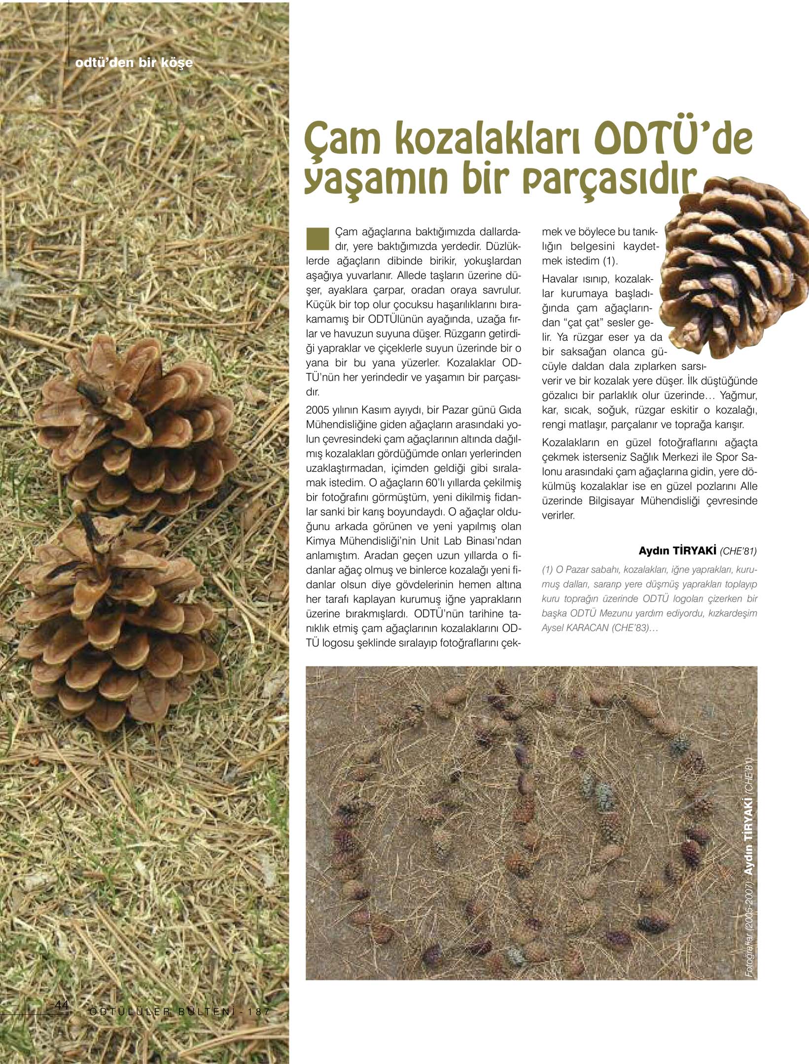 Çam ağaçlarına baktığımızda dallardadır, yere baktığımızda yerdedir. Düzlüklerde ağaçların dibinde birikir, yokuşlardan aşağıya yuvarlanır. Allede taşların üzerine düşer, ayaklara çarpar, oradan oraya savrulur. Küçük bir top olur çocuksu haşarılıklarını bırakamamış bir ODTÜlünün ayağında, uzağa fırlar ve havuzun suyuna düşer. Rüzgarın getirdiği yapraklar ve çiçeklerle suyun üzerinde bir o yana bir bu yana yüzerler. Kozalaklar ODTÜ’nün heryerindedir ve yaşamın bir parçasıdır.