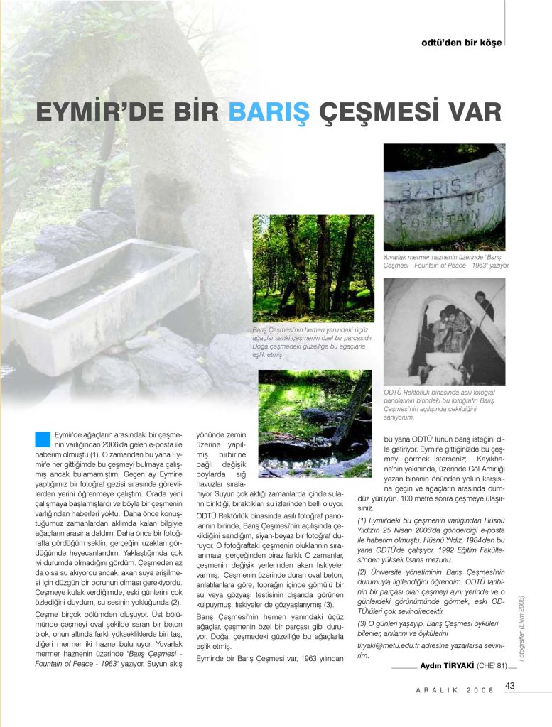 (2) Üniversite yönetiminin Barış Çeşmesi’nin durumuyla ilgilendiğini öğrendim. ODTÜ tarihinin bir parçası olan çeşmeyi aynı yerinde ve o günlerdeki görünümünde görmek eski ODTÜlüleri çok sevindirecektir.