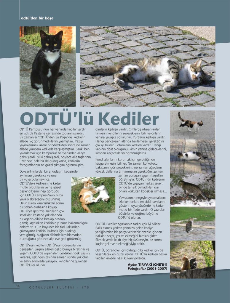 ODTÜ Kampusunun her yanında kediler vardır, en çok da Pastane çevresinde toplanmışlardır. Bir zamanlar “ODTÜ’den bir köşe”de, kedilerin allede hiç görünmediklerini yazmıştım. Yazıyı yayımlanmak üzere gönderdikten sonra ne zaman allede yürüsem kedilerle karşılaşmıştım. Sanki beni yalanlamak için kampusun her yanından alleye gelmişlerdi. İyi ki gelmişlerdi, böylece alle taşlarının üzerinde, hele bir de güneş varsa, kedilerin fotoğraflarının ne güzel çıktığını öğrenmiştim.