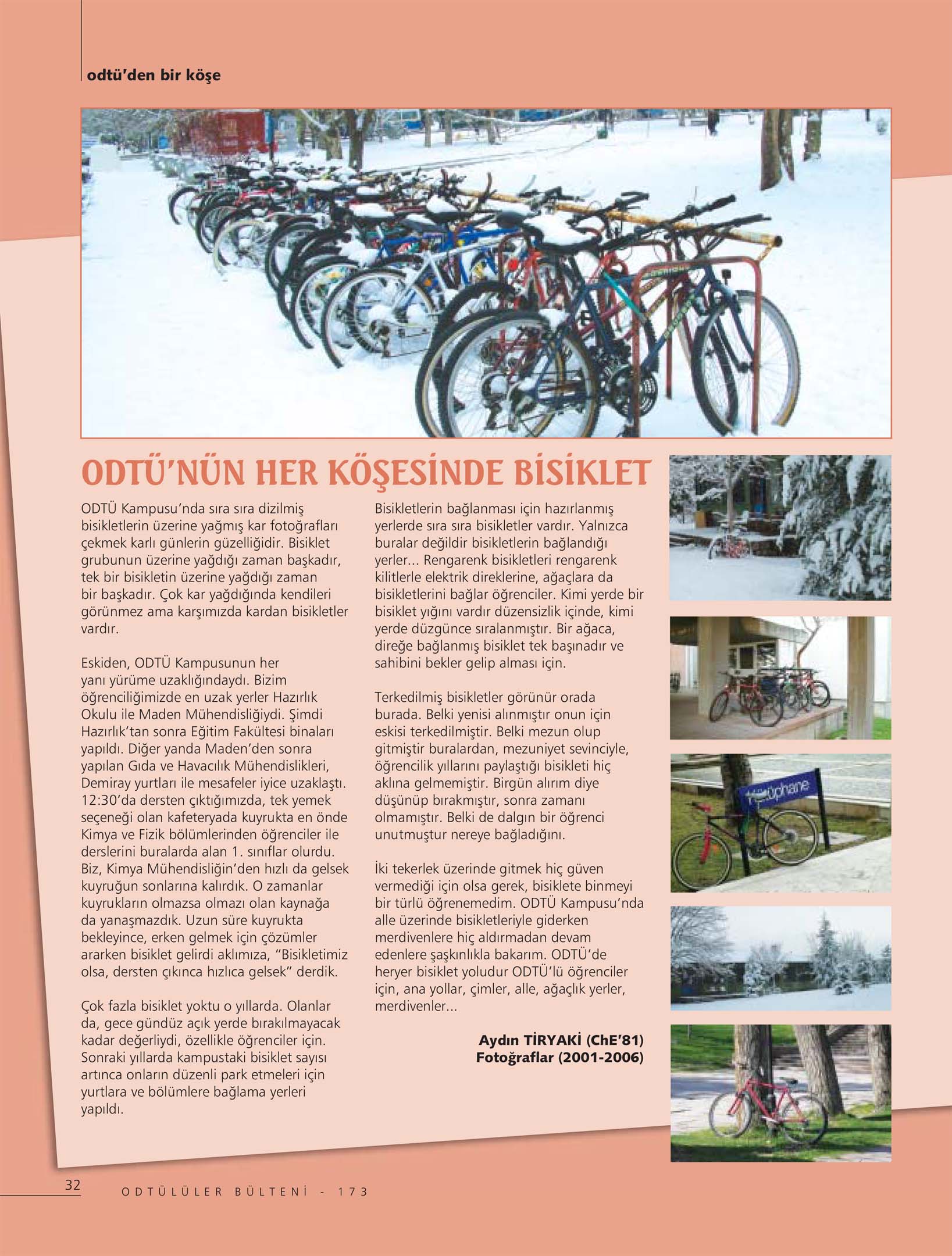 İki tekerlek üzerinde gitmek hiç güven vermediği için olsa gerek, bisiklete binmeyi bir türlü öğrenemedim. ODTÜ Kampusunda alle üzerinde bisikletleriyle giderken merdivenlere hiç aldırmadan devam edenlere şaşkınlıkla bakarım. ODTÜ’de heryer bisiklet yoludur ODTÜlü öğrenciler için, ana yollar, çimler, alle, ağaçlık yerler, merdivenler…