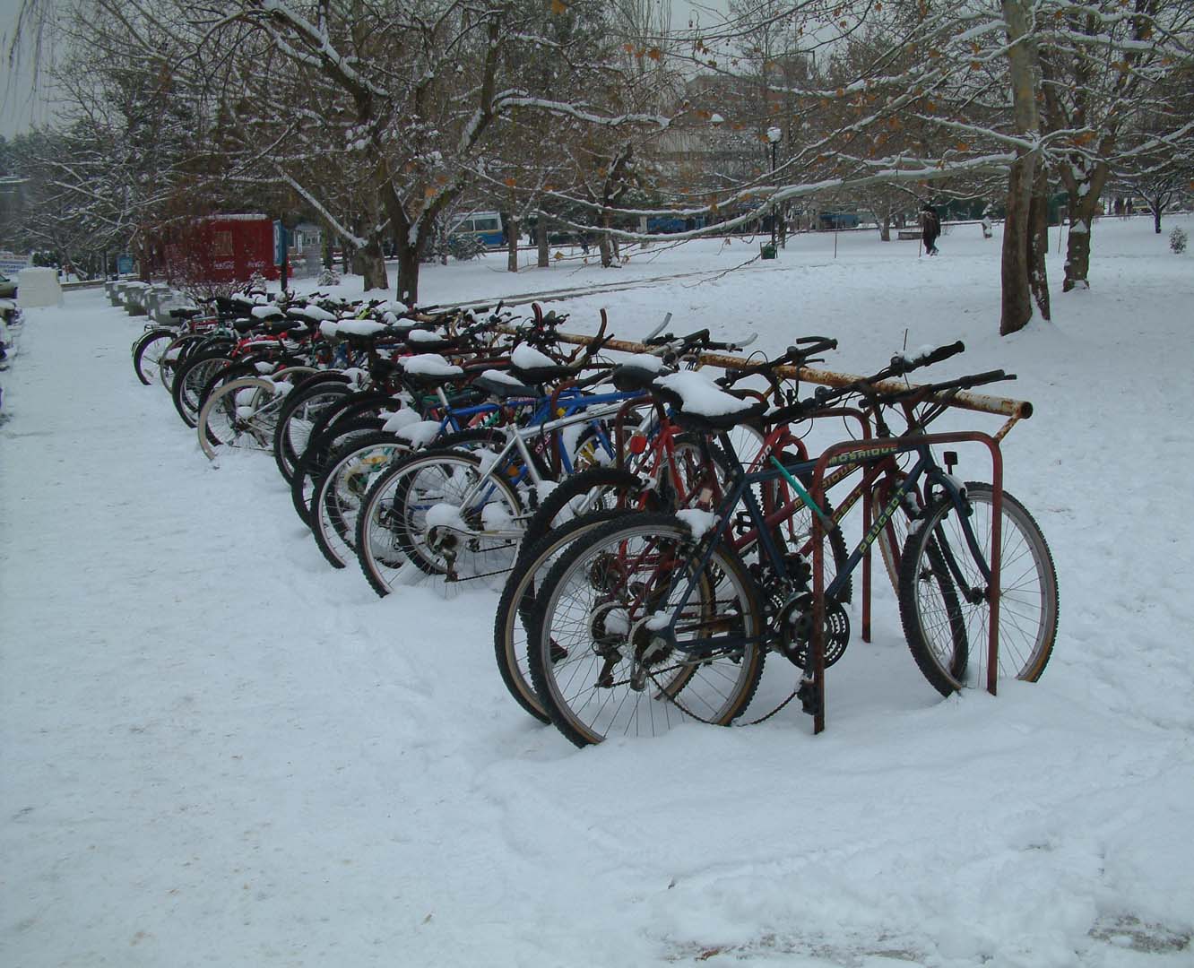ODTÜ kampusunda sıra sıra dizilmiş bisikletlerin üzerine yağmış kar fotoğrafları çekmek karlı günlerin güzelliğidir. Bisiklet grubunun üzerine yağdığı zaman başkadır, tek bir bisikletin üzerine yağdığı zaman bir başkadır. Çok kar yağdığında kendileri görünmez ama karşımızda kardan bisikletler vardır.