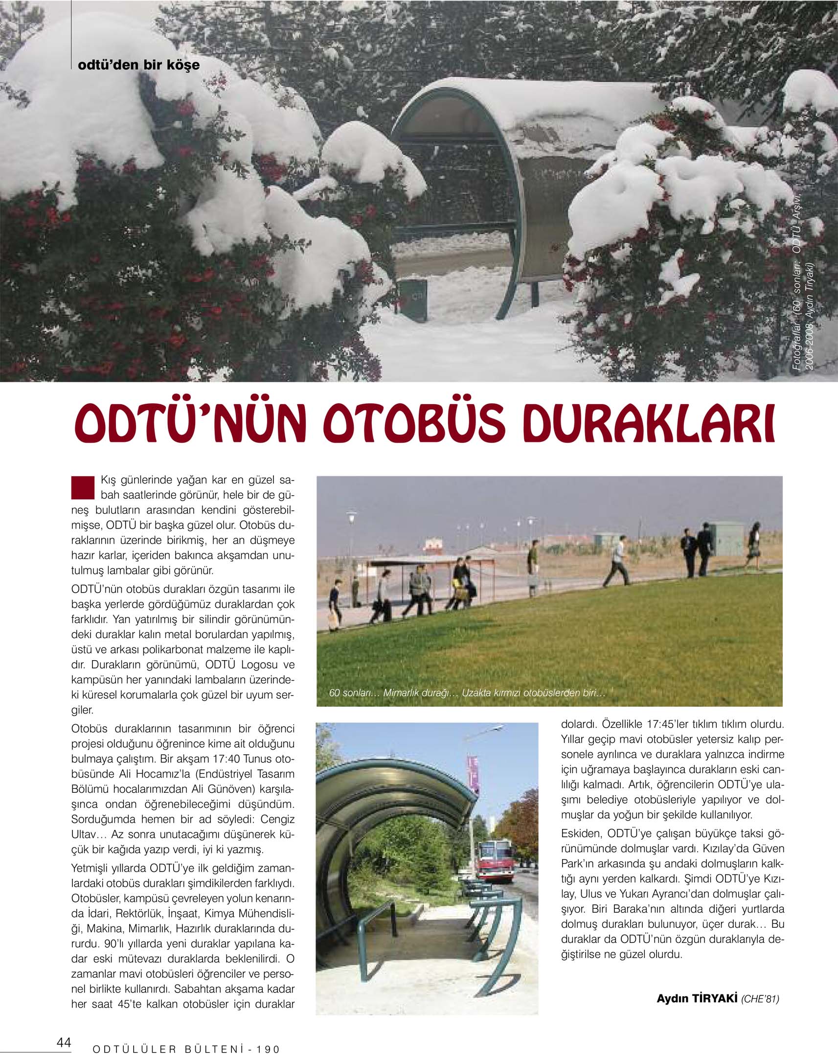 Yetmişli yıllarda ODTÜ’ye ilk geldiğim zamanlardaki otobüs durakları şimdikilerden farklıydı. Otobüsler, kampusu çevreleyen yolun kenarında İdari, Rektörlük, İnşaat, Kimya Mühendisliği, Makina, Mimarlık, Hazırlık duraklarında dururdu. 90’lı yıllarda yeni duraklar yapılana kadar eski mütevazı duraklarda beklenilirdi. O zamanlar mavi otobüsleri öğrenciler ve personel birlikte kullanırdı. Sabahtan akşama her saat 45’te kalkan otobüsler için duraklar dolardı. Özellikle 17:45’ler tıklım tıklım olurdu. Yıllar geçip mavi otobüsler yetersiz kalıp personele ayrılınca ve duraklara yalnızca indirme için uğramaya başlayınca durakların eski canlılığı kalmadı. Artık, öğrencilerin ODTÜ’ye ulaşımı belediye otobüsleriyle yapılıyor ve dolmuşlar da yoğun bir şekilde kullanılıyor.