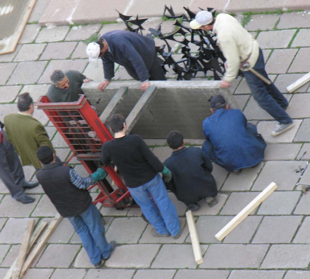 Kısa bir süre geçtikten sonra heykelin yakınında bir kalıp içine beton platform döküldü, birkaç gün orada kuruması beklendi ve heykel yerinden sökülüp bu platform üzerine yeniden monte edildi. Böylece görme engellilerin beyaz bastonları bu platformu yakalayacak ve heykelin kendilerine zarar vermesi önlenmiş olacaktı.