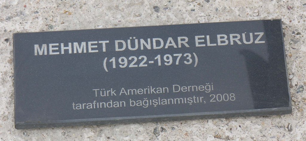 Heykelin daha sonra eklenen beton platformu üzerine yatay olarak bir plaka üzerinde “MEHMET DÜNDAR ELBRUZ (1922-1973) Türk Amerikan Derneği tarafından bağışlanmıştır, 2008” yazıyor.