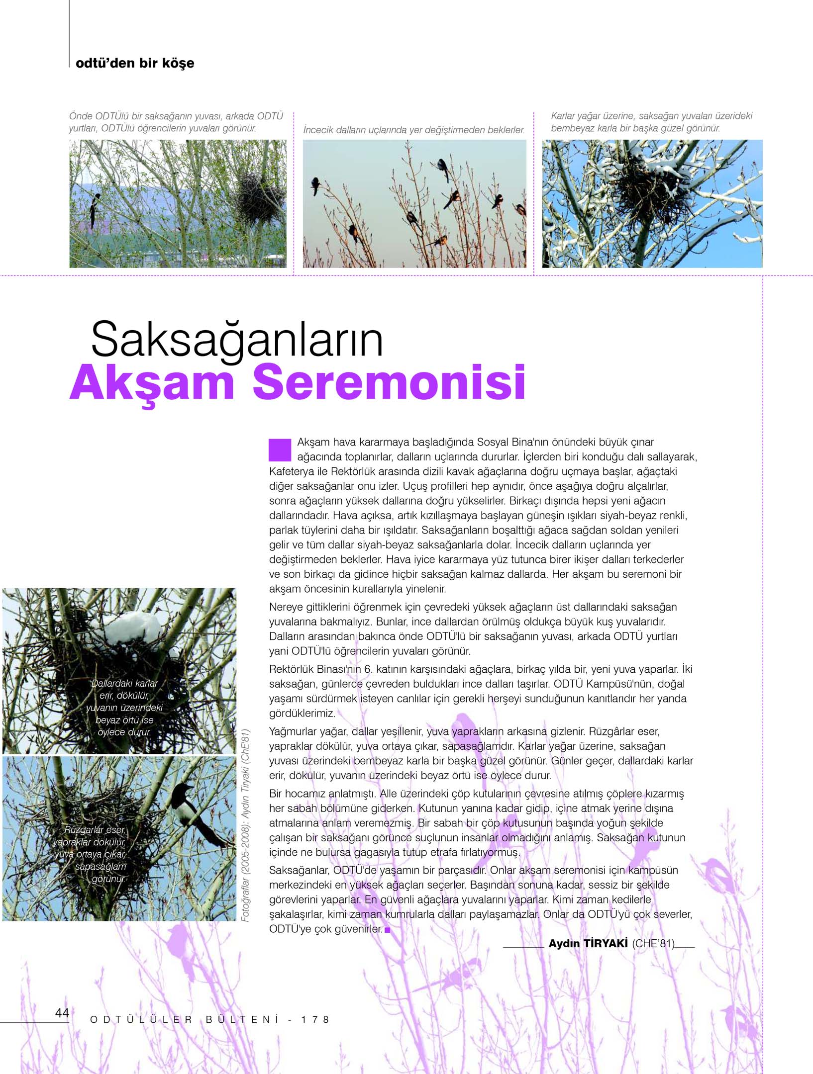 ODTÜ’den Bir Köşe yazılarımı tamamladıktan sonra ODTÜlüler Dergisine göndermeden önce mutlaka bir kişinin okumasını isterdim. O sırada ODTÜ’deysem çevremdeki ODTÜlü arkadaşlara verirdim, gelen değerlendirmelere göre gerekirse son düzeltmeleri yapıp dergiye gönderirdim. Akşamları veya hafta sonları yazıyı evde tamamladığımda, o da bir ODTÜlü olan kızkardeşim Aysel Karacan’a (Chem’83) gönderirdim. Saksağanlarla ilgili yazıyı yazdım: SAKSAĞANLARIN AKŞAM SEREMONİSİ (Ekim 2008). Yazı Ekim sayısında olduğuna göre demek ki 2008 Eylül ayıymış. Okuyacak, hatalar varsa bulacak ben de düzeltip dergiye göndereceğim. O sırada yanında henüz ilkokulda olan yeğenimizin olduğunu biliyordum. Bir süre önce “saksağan” için “kaskağan” dediği için ona takılır dururduk. O zamanlar yazıları e-mail ile gönderiyoruz, henüz WhatsApp yok. Word dosyasındaki bütün “saksağan”ları “kaskağan” olarak değiştirip bir şaka dosyası gönderdim ve yazıyı beraber okumalarını söyledim. Bilgisayarı açıp yazıyı görünce heyecanla “bak işte kaskağan, benim dediğim doğruymuş” demiş. O yazı eskidi ama bu hoş anı hep canlı…