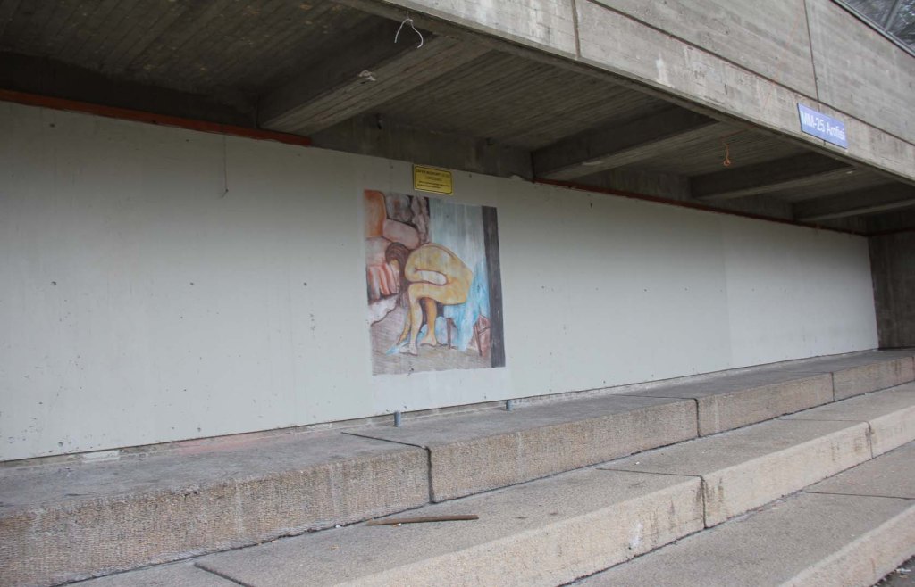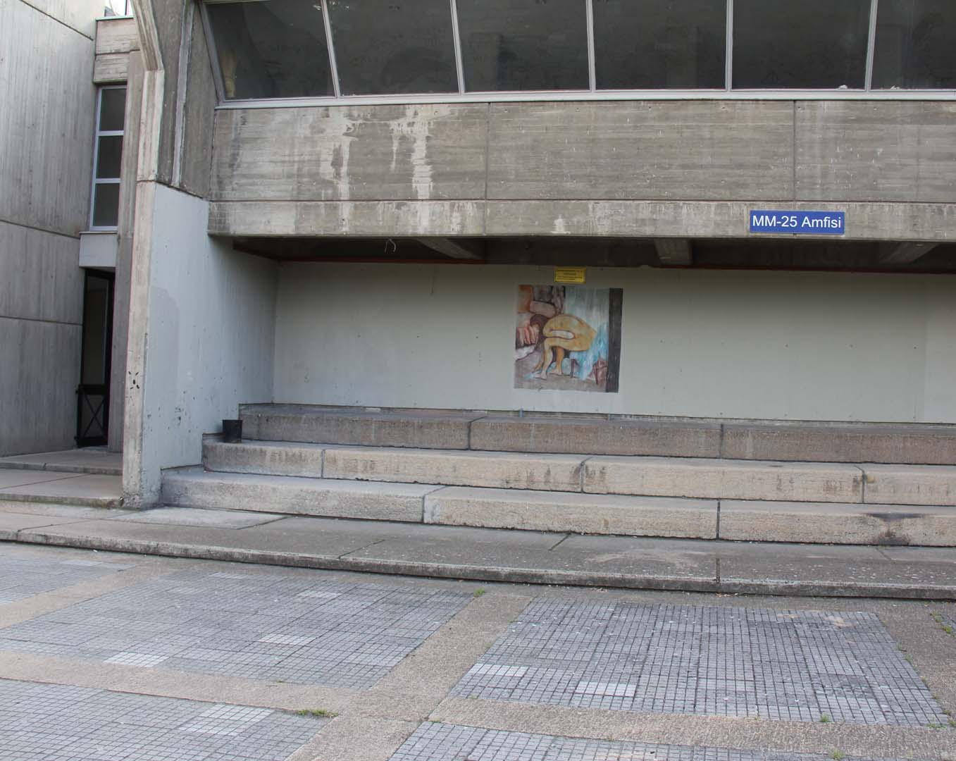 MM’in önündeki kare parkelerle kaplanmış boşluğun yanındaki MM-25 amfisinin bu alana bakan beton yüzünde bir resim vardır. Beton kalıbının 40 yıldan uzun zaman önce betonun yüzeyinde bıraktığı bütün izler aynen resim üzerinde de görünür.