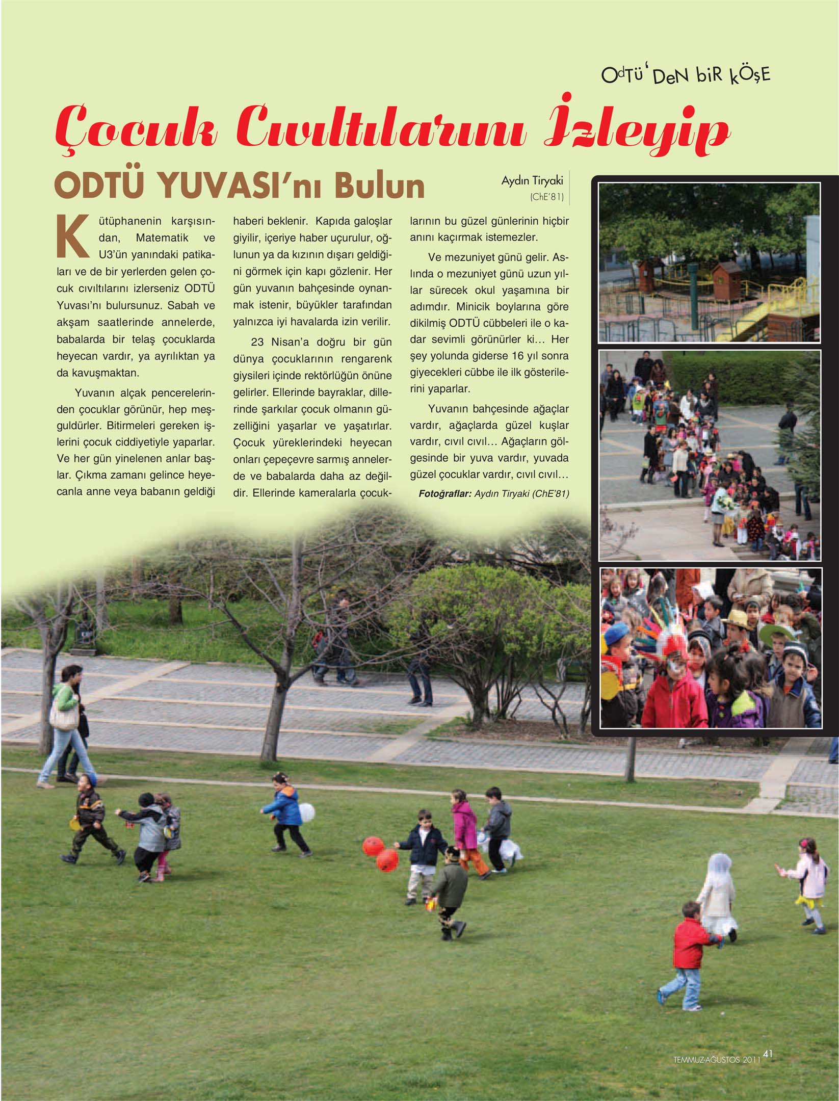 Kütüphanenin karşısından, Matematik ve U3’ün yanındaki patikaları ve de biryerlerden gelen çocuk cıvıltılarını izlerseniz ODTÜ Yuvası’nı bulursunuz. Sabah ve akşam saatlerinde annelerde, babalarda bir telaş çocuklarda heyecan vardır, ya ayrılıktan ya da kavuşmaktan.