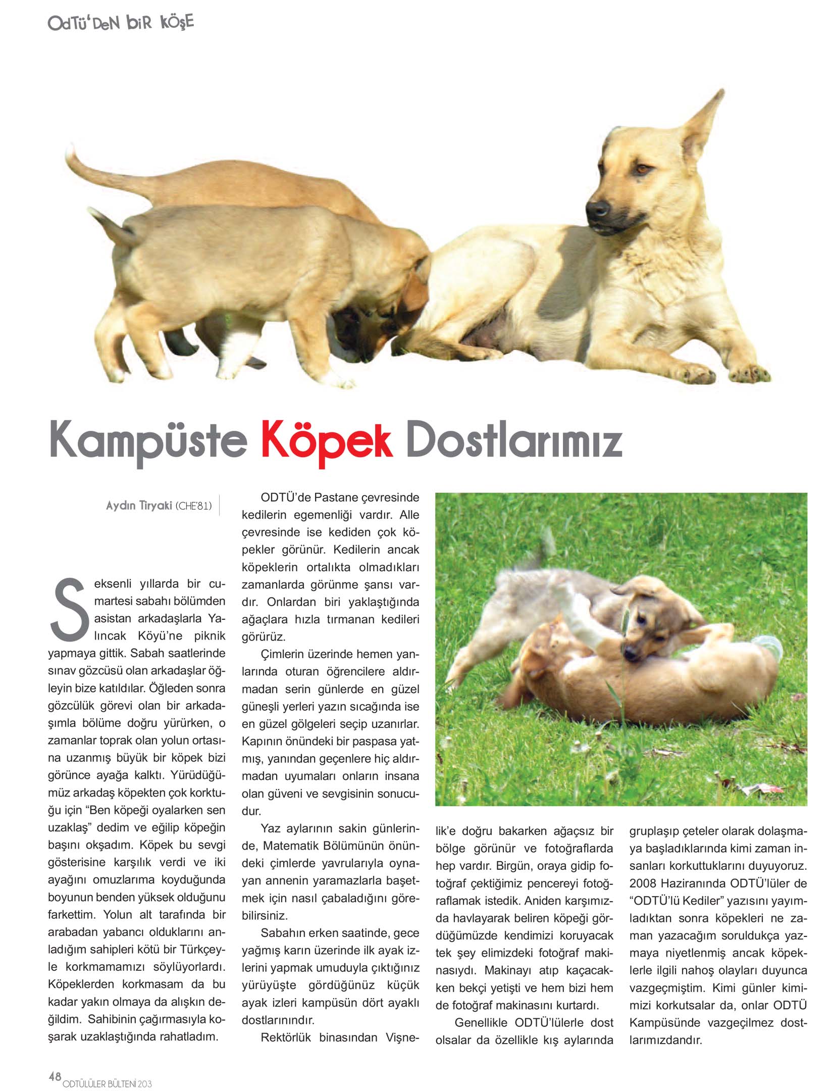 Genellikle ODTÜlülerle dost olsalar da özellikle kış aylarında gruplaşıp çeteler olarak dolaşmaya başladıklarında kimi zaman insanları korkuttuklarını duyuyoruz. 2008 Haziranında ODTÜLÜLER’de “ODTÜlü Kediler” yazısını yayımladıktan sonra köpekleri ne zaman yazacağım soruldukça yazmaya niyetlenmiş ancak köpeklerle ilgili nahoş olayları duyunca vazgeçmiştim. Kimi günler kimimizi korkutsalar da, onlar ODTÜ Kampusunda vazgeçilmez dostlarımızdandır.