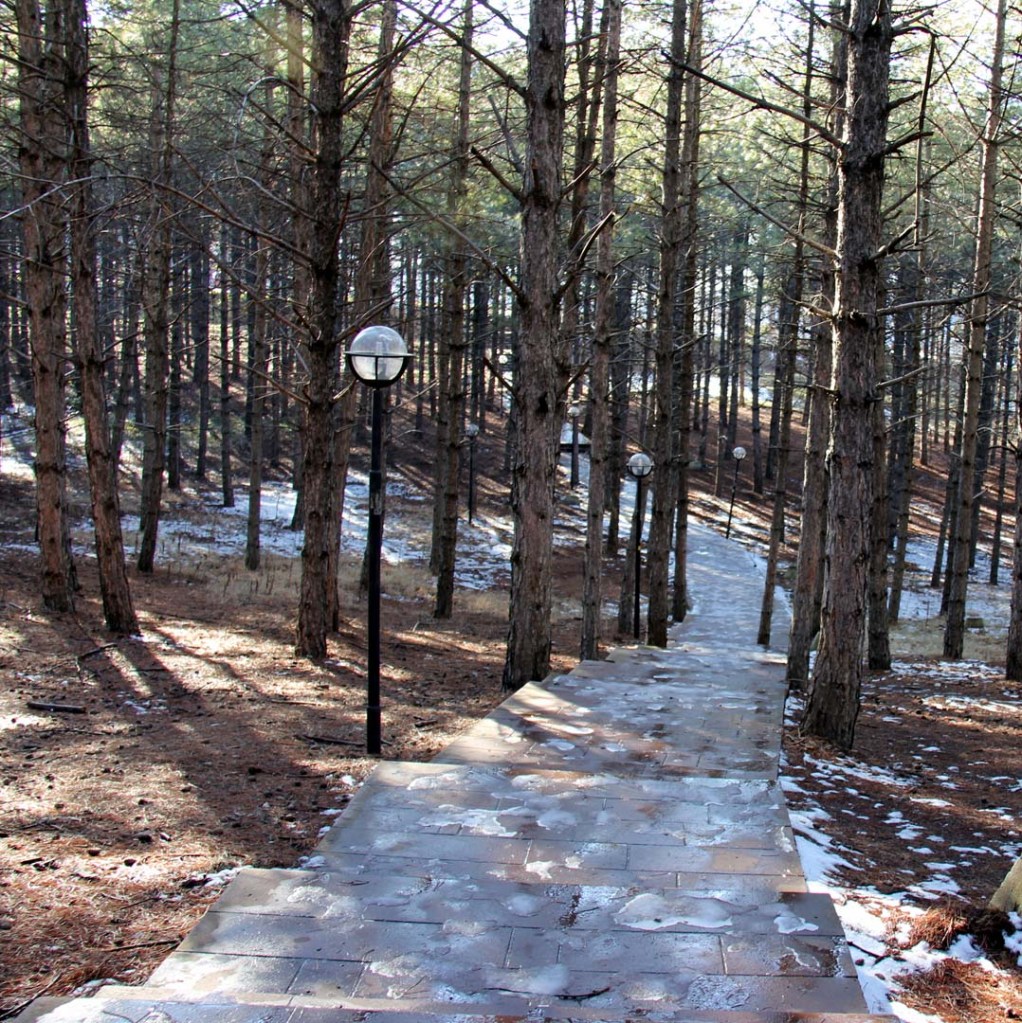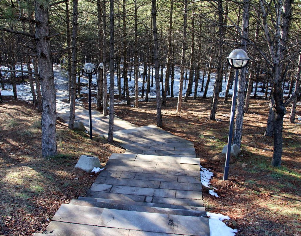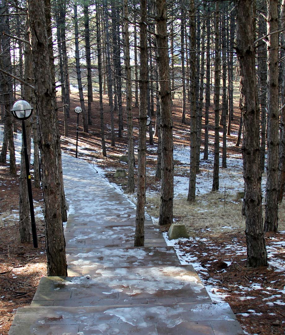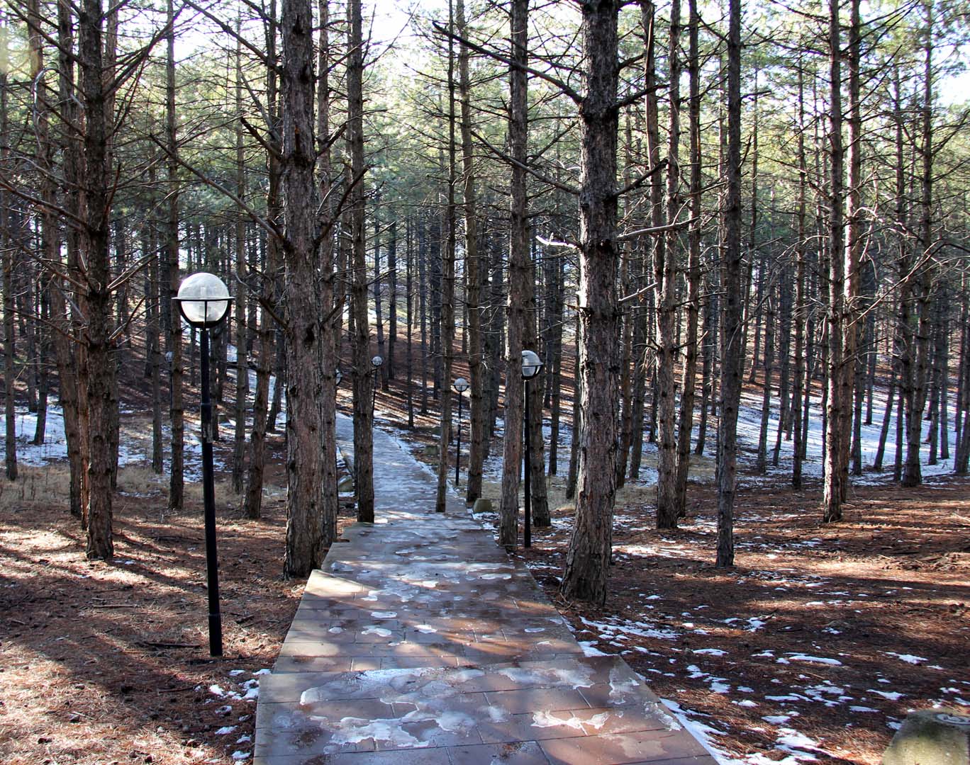 Unit Lab’ın arka tarafından araba yoluna inen merdivenlerde henüz eriyememiş karlara basarak yürüyüp yolun karşısına geçince büyük kaldırım taşlarından yapılmış bir yolun başlangıcına geldim. Yol ağaçların arasında sağa sola kıvrılarak, önce bir iniş, sonra da çıkıştan sonra Gıda Mühendisliği binasının önünden geçen yola ulaşıyordu. Güzergah belirlenirken ağaçların hiçbirine dokunulmamış. Yaya yolunun en güzel yeri yolun ortasında kalmış bir ağaç için taşların arasında bırakılmış boşluk, yani taşların arasında yolda bir ağaç… Çam ağaçlarından dökülüp zemini kaplayan kurumuş ama yağan karlarla ıslanmış iğne yaprakların üzerinde yere düştüğünden buyana çok zaman geçtiği belli olan kozalaklar görünüyordu. Kar erimiş olmasına karşın gölgelerde beyaz adalar olarak sağa sola serpilmiş duruyorlardı.