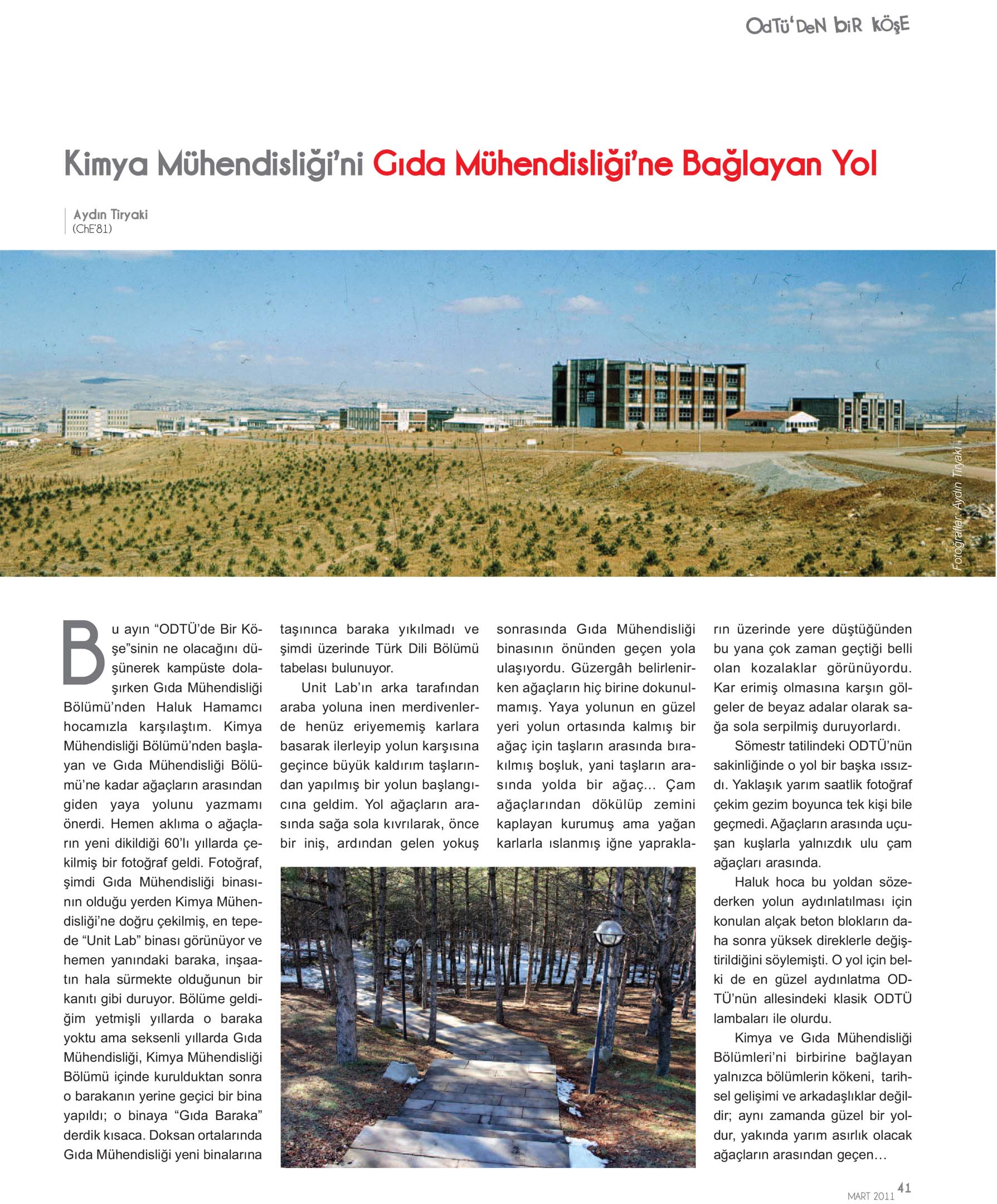 Bu ayın “ODTÜ’de Bir Köşe”sinin ne olacağını düşünerek ODTÜ’de dolaşırken Gıda Mühendisliği Bölümünden Haluk Hamamcı hocamızla karşılaştım. Kimya Mühendisliğinden başlayan ve Gıda Mühendisliğine kadar ağaçların arasından giden yaya yolunu yazmamı önerdi. Hemen aklıma o ağaçların yeni dikildiği 60’lı yıllarda çekilmiş bir fotoğraf geldi. Fotoğraf, şimdi Gıda Mühendisliği binasının olduğu yerden Kimya Mühendisliğine doğru çekilmiş, en tepede Unit Lab binası görünüyor ve hemen yanındaki baraka inşaatın hala sürmekte olduğunun bir kanıtı gibi duruyor. Bölüme geldiğim yetmişli yıllarda o baraka yoktu ama seksenli yıllarda Gıda Mühendisliği, Kimya Mühendisliği Bölümü içinde kurulduktan sonra o barakanın yerine geçici bir bina yapıldı, o binaya Gıda Baraka derdik kısaca. Doksan ortalarında Gıda Mühendisliği yeni binalarına taşınınca baraka yıkılmadı ve şimdi üzerinde Türk Dili Bölümü tabelası bulunuyor.