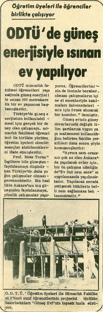 1976 yılına ait bir “ODTÜ’de güneş enerjisiyle ısınan ev yapılıyor” başlıklı gazete haberinde şöyle yazılmış (1):