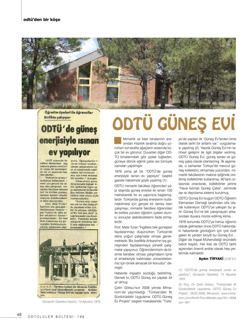- “ODTÜ’de güneş enerjisiyle ısınan ev yapılıyor”, Günaydın Gazetesi, 14 Ağustos 1976