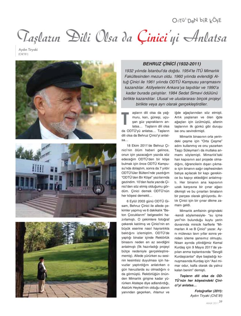 18 Ekim 2011’de Behruz Çinici’nin ölüm haberi gelince, onun için yazacağım yazıda sözedeceğim ODTÜ’den bir köşe bulmak için önce ODTÜ kampüsünde dolaştım sonra da 7 yıldır ODTÜlüler’de yazdığım “ODTÜ’den bir köşe” yazılarında gezindim. 10’dan fazla yazıda Çinici’den sözetmiş olduğumu gördüm. Çinici demek ODTÜ’nün her köşesi demekti…