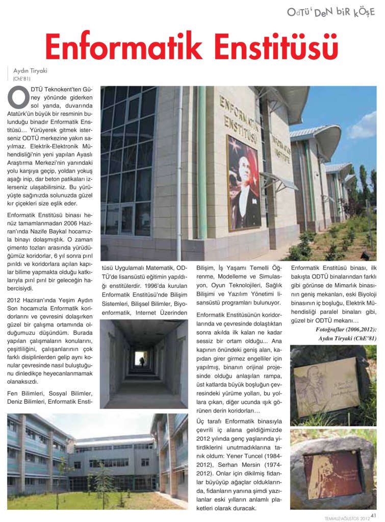 Enformatik Enstitüsü binası henüz tamamlanmadan 2006 Haziran’ında Nazife Baykal hocamızla binayı dolaşmıştık. O zaman çimento tozları arasında yürüdüğümüz koridorlar, 6 yıl sonra pırıl pırıldı ve koridorlara açılan kapılar bilime yapmakta olduğu katkılarıyla pırıl pırıl bir geleceğin habercisiydi. 2012 Haziran’ında Yeşim Aydın Son hocamızla Enformatik koridorlarını ve çevresini dolaşırken güzel bir çalışma ortamında olduğumuzu düşündüm. Burada yapılan çalışmaların konularını, çeşitliliğini, çalışanlarının çok farklı disiplinlerden gelip aynı konular çevresinde nasıl buluştuğunu dinledikçe heyecanlanmamak olanaksızdı.