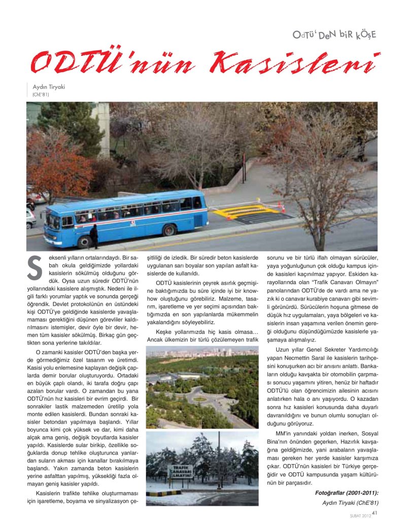 Keşke yollarımızda hiç kasis olmasa… Ancak ülkemizin bir türlü çözülemeyen trafik sorunu ve bir türlü iflah olmayan sürücüler, yaya yoğunluğunun çok olduğu kampus içinde kasisleri kaçınılmaz yapıyor. Eskiden karayollarında olan “Trafik Canavarı Olmayın” panolarından ODTÜ’de de vardı ama ne yazık ki o canavar kurabiye canavarı gibi sevimli görünürdü. Sürücülerin hoşuna gitmese de düşük hız uygulamaları, yaya bölgeleri ve kasislerin insan yaşamına verilen önemin gereği olduğunu düşündüğümüzde kasislerle yaşamaya alışmalıyız.