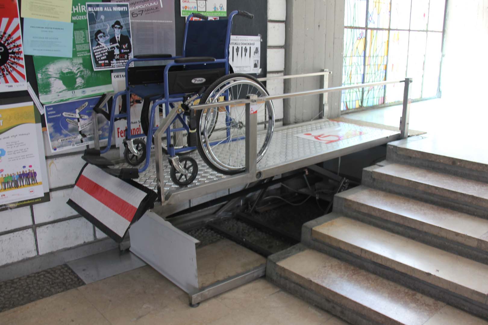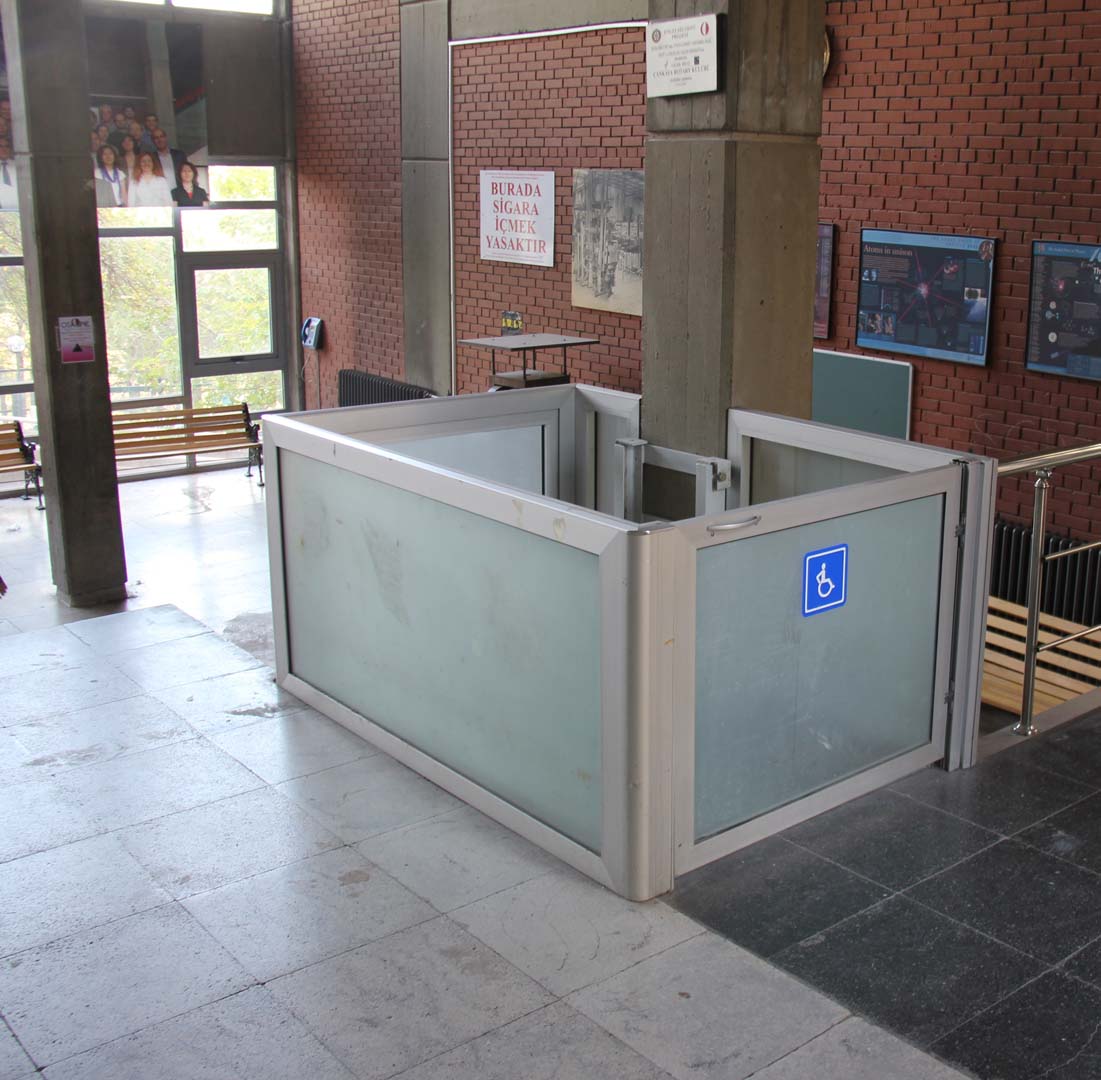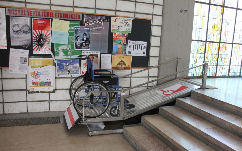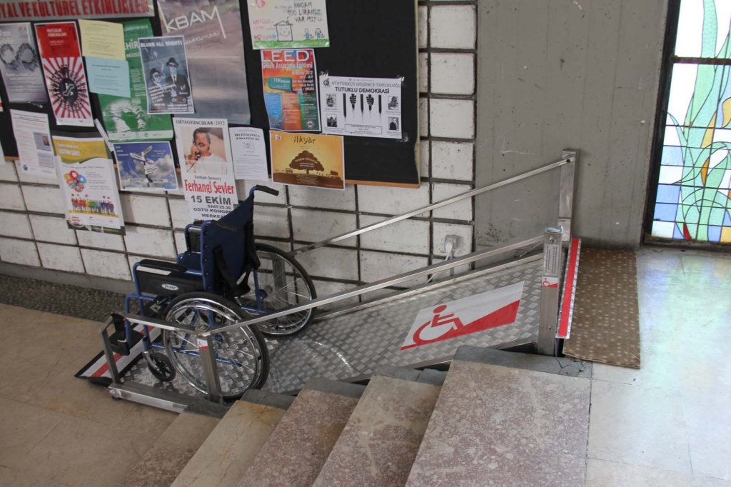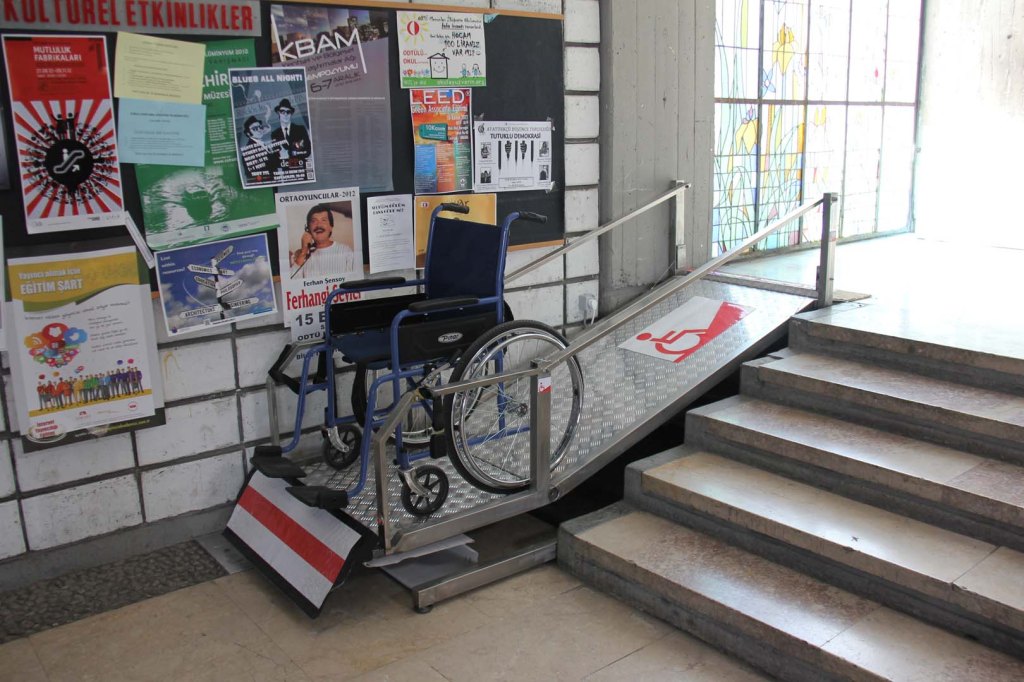 70’li yıllarda çizim dersi için karton almamız gerektiğinde Mimarlık binasındaki kırtasiyeye giderdik. Şimdi de aynı köşede duvarları olmayan o kırtasiye duruyor. Tam onun karşısında stüdyoların olduğu koridorun başında karşımıza çıkan beş basamaklı engelin şimdi engel olmadığını görüyoruz. Merdivenin yanındaki düzeneğin üzerinde duran tekerlekli sandalye olmasa bir engelli erişim sistemi olduğunu ilk bakışta anlamak zor olurdu. Sistemi tasarlayan ve patentini alan Ataman Özdemir hocamızla konuşurken minimal tasarımın sistemi bu kadar kullanışlı yaptığını düşündüm. Kullanımı çok kolaydı ve yalnızca yanındaki merdiven kadar yer kapılıyordu. Ataman hocamız, engelli araçlarıyla yardımsız çıkılabilmesi ve güvenlik içinde inilebilmesi için eğimlerin %3-%4’ten fazla olmaması gerektiği anlattığında az yer tutmasının önemini anladım.1-2 basamaklı yerlerde bu eğimi başka rahatsızlıklar vermeden yapmak olanaklı olsa da 3 basamaktan sonra eğimli yolların kendilerinin engel olmaya başladığını basit bir hesapla görebiliyoruz.