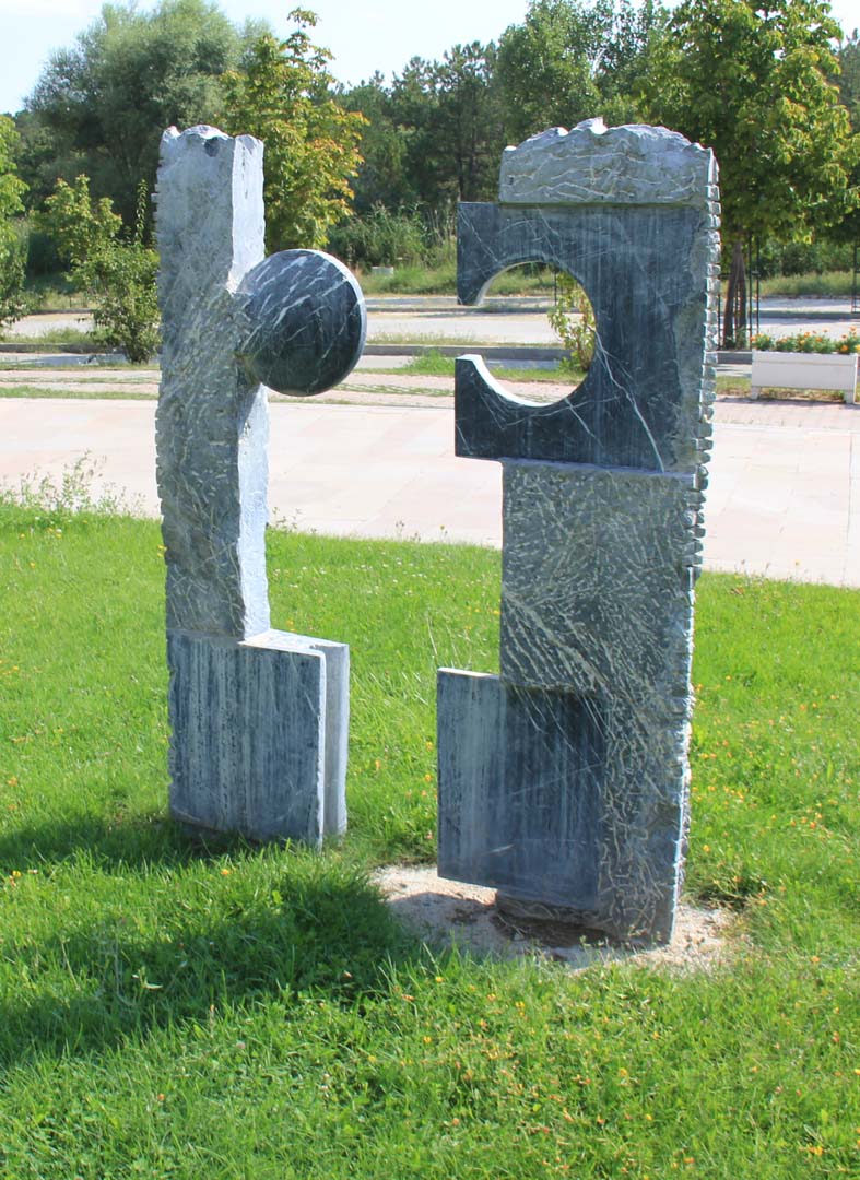 Heykel birbirini tamamlayan iki parçadan oluşuyor. Her iki parça da yekpare mermer ile çalışılmış. Heykel beton desteği ile çim alana yerleştirilmiş. Yüzeylerin kimi bölümleri düzeltilerek işlenmiş, kimi bölümleri ise mermerin doğal görünümüne yakın bırakılmış. “HU 1993” imzası KKM’ye karşıdan bakınca sol taraftaki parçada düzleştirilmiş yüzeye kabartı olarak atılmış. İmza biraz gizlenmiş, eğilip aramayınca görmek olanaksız.
