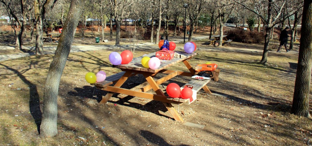 Bahar günlerinde hep dolu olan masalar ve banklar boştu, bu masalardan yalnızca birinde iki kişilik bir hazırlık vardı. Balonlar şişirilip masanın köşelerinde bağlanmış, masanın ortasında bir pasta kutusu… Masada hazırlıkları yapan romantik gence sorduğumda bir doğum günü sürprizi hazırlandığını öğrendim. Bir saat sonra yeniden oradan geçtiğimde masanın üzerindeki iki karton çay bardağından başka bir iz kalmamıştı.