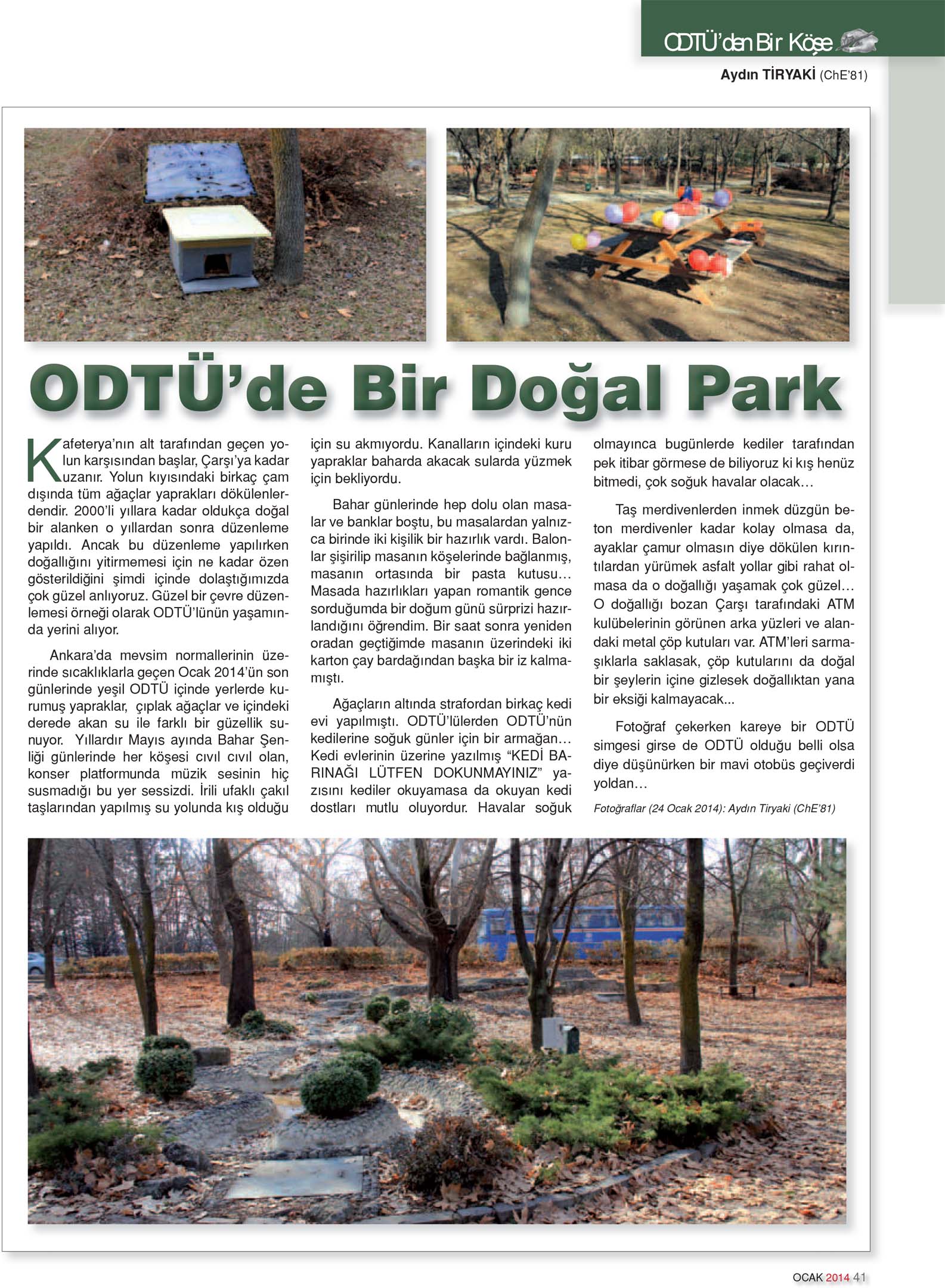 Ankara’da mevsim normallerinin üzerinde sıcaklıklarla geçen Ocak 2014’ün son günlerinde yeşil ODTÜ içinde yerlerde kurumuş yapraklar, çıplak ağaçlar ve içindeki derede akan su ile farklı bir güzellik sunuyor. Yıllardır Mayıs ayında Bahar Şenliği günlerinde her köşesi cıvıl cıvıl olan, konser platformunda müzik sesinin hiç susmadığı bu yer sessizdi. İrili ufaklı çakıl taşlarından yapılmış su yolunda kış olduğu için su akmıyordu. Kanalların içindeki kuru yapraklar baharda akacak sularda yüzmek için bekliyordu.