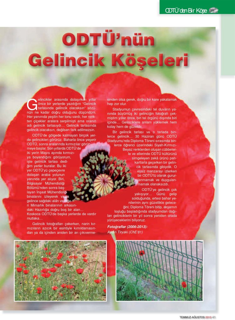ODTÜ’ye gelincik çok yakışıyor… Günü gelip solduğunda, ertesi bahar yenilerinin aynı güzellikle geleceğini; Diploma Töreni bitip, akşamın loşluğu başladığında stadyumdan dağılan gelinciklerin bir yıl sonra yeniden orada yürüyeceklerini biliyoruz.