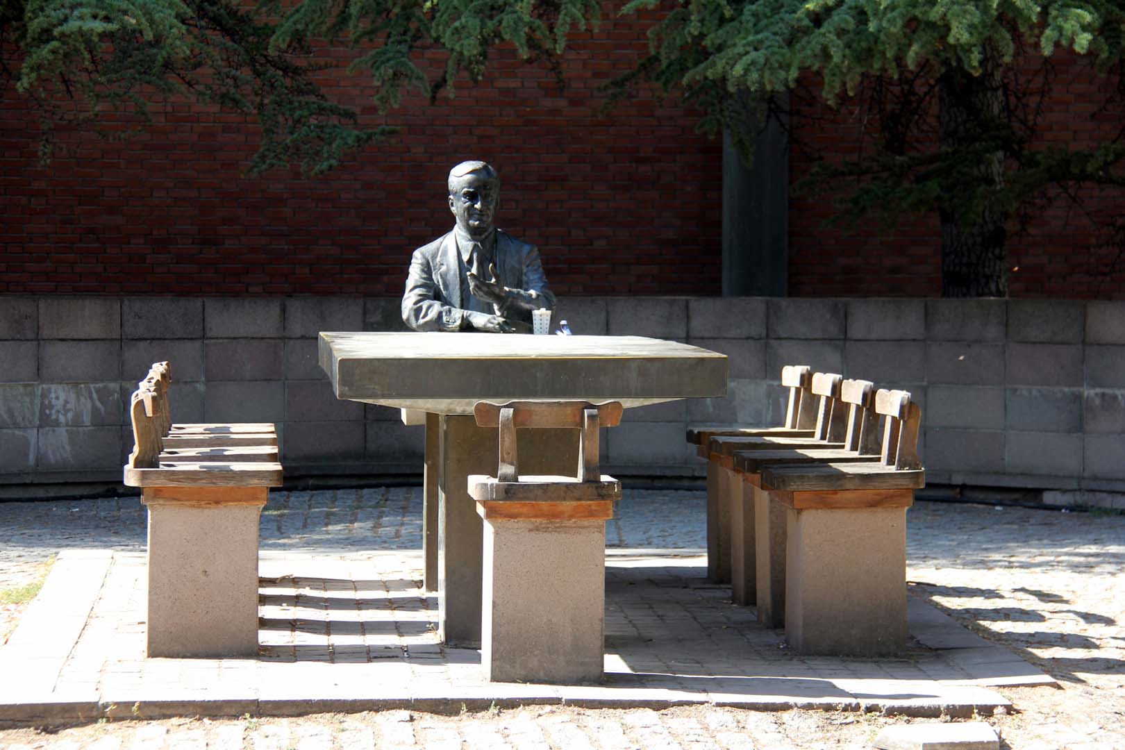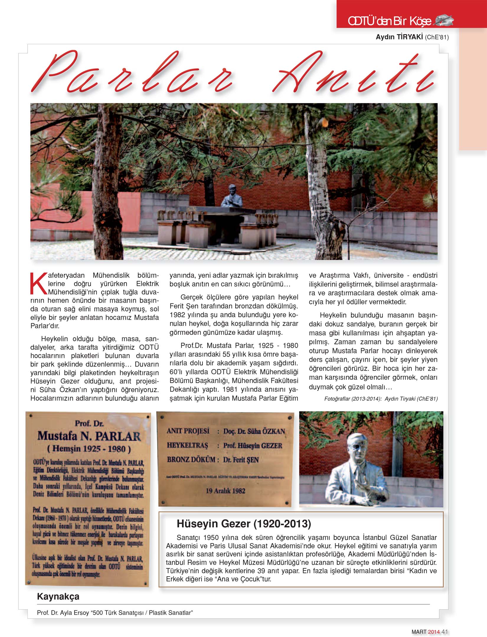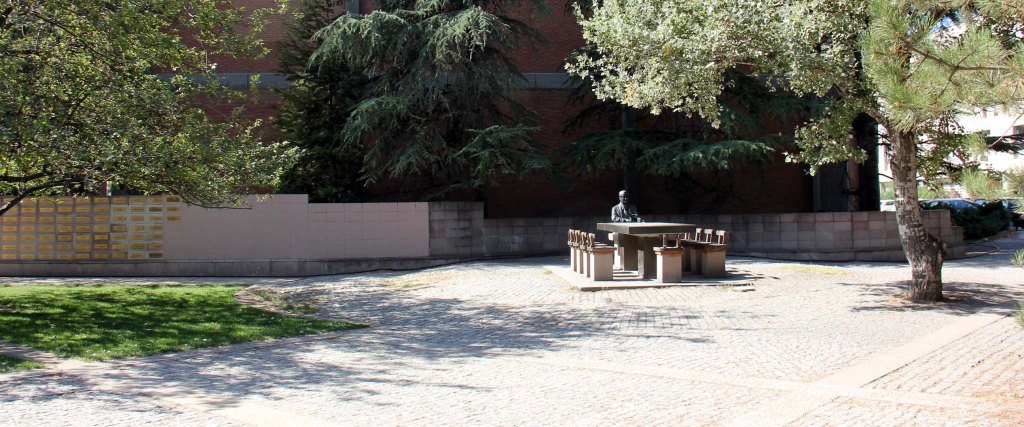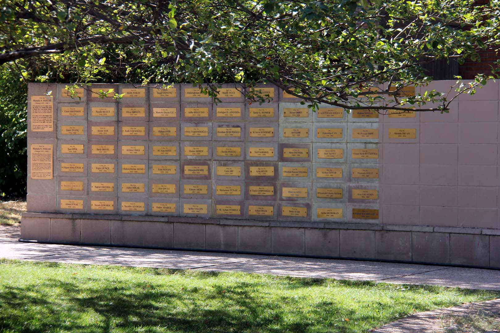 Heykelin olduğu bölge, masa, sandalyeler, arka tarafta yitirdiğimiz ODTÜ hocalarının plaketleri bulunan duvarla bir park şeklinde düzenlenmiş… Duvarın yanındaki bilgi plaketinden heykeltraşın Hüseyin Gezer olduğunu, anıt projesini Süha Özkan’ın yaptığını öğreniyoruz. Hocalarımızın adlarının bulunduğu alanın yanında, yeni adlar yazmak için bırakılmış boşluk anıtın en can sıkıcı görünümü…